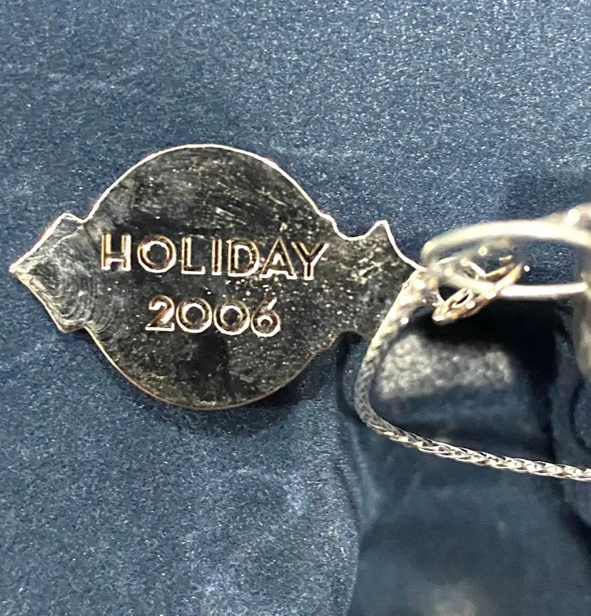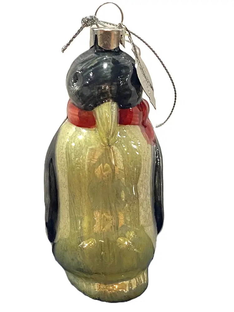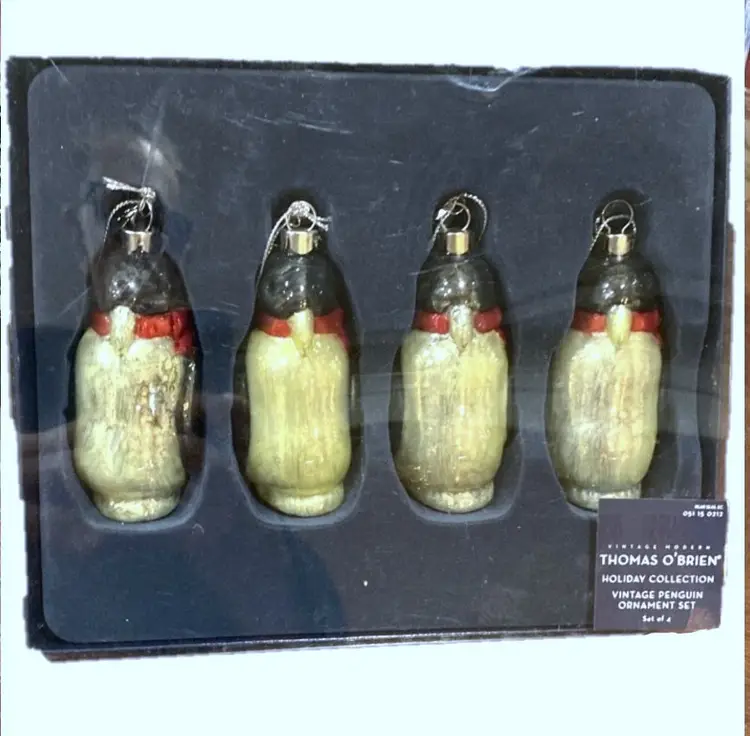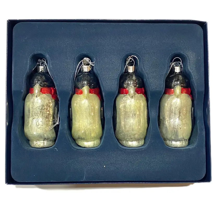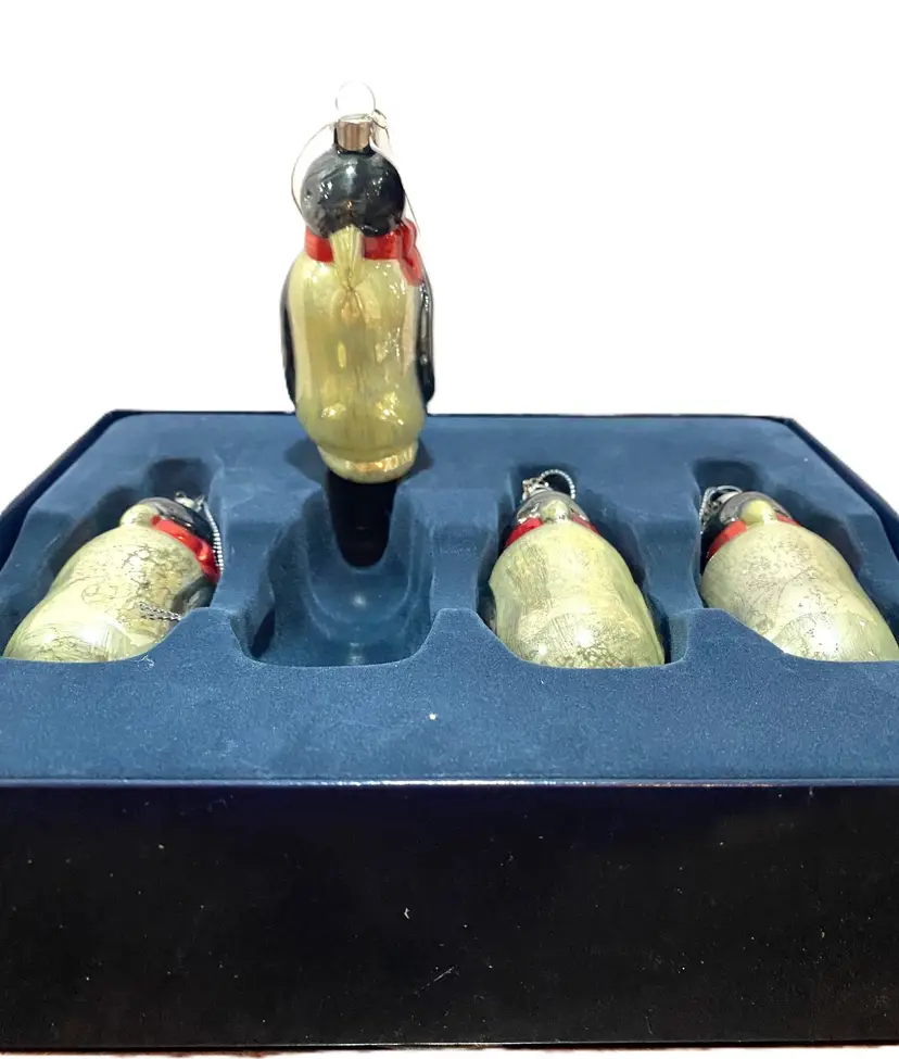 Set of 4 hand-blown glass penguin ornaments 2006, adorned with red scarves and silver strings for hanging. NEW IN ORIGINAL PACKAGE.