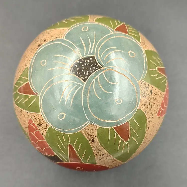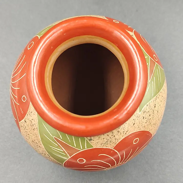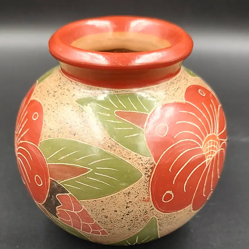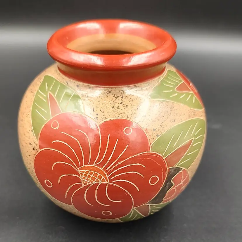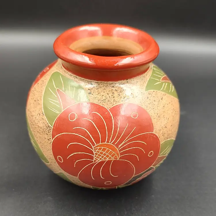Nicaraguan Hand Painted Floral Art Pottery Vase. Height 3.5" x diameter 4". Made in Nicaragua