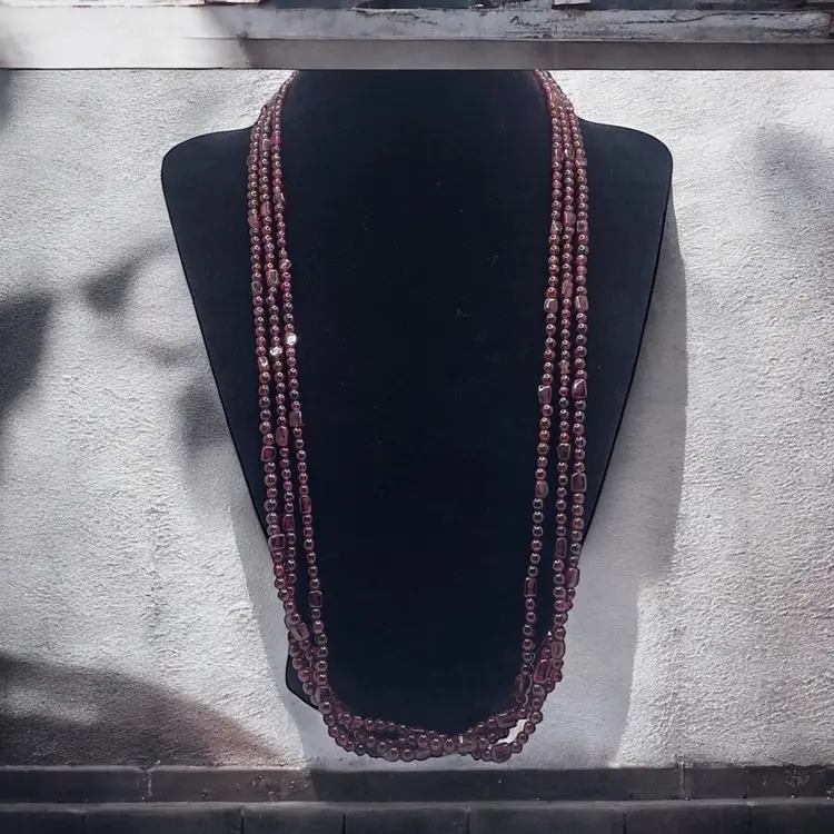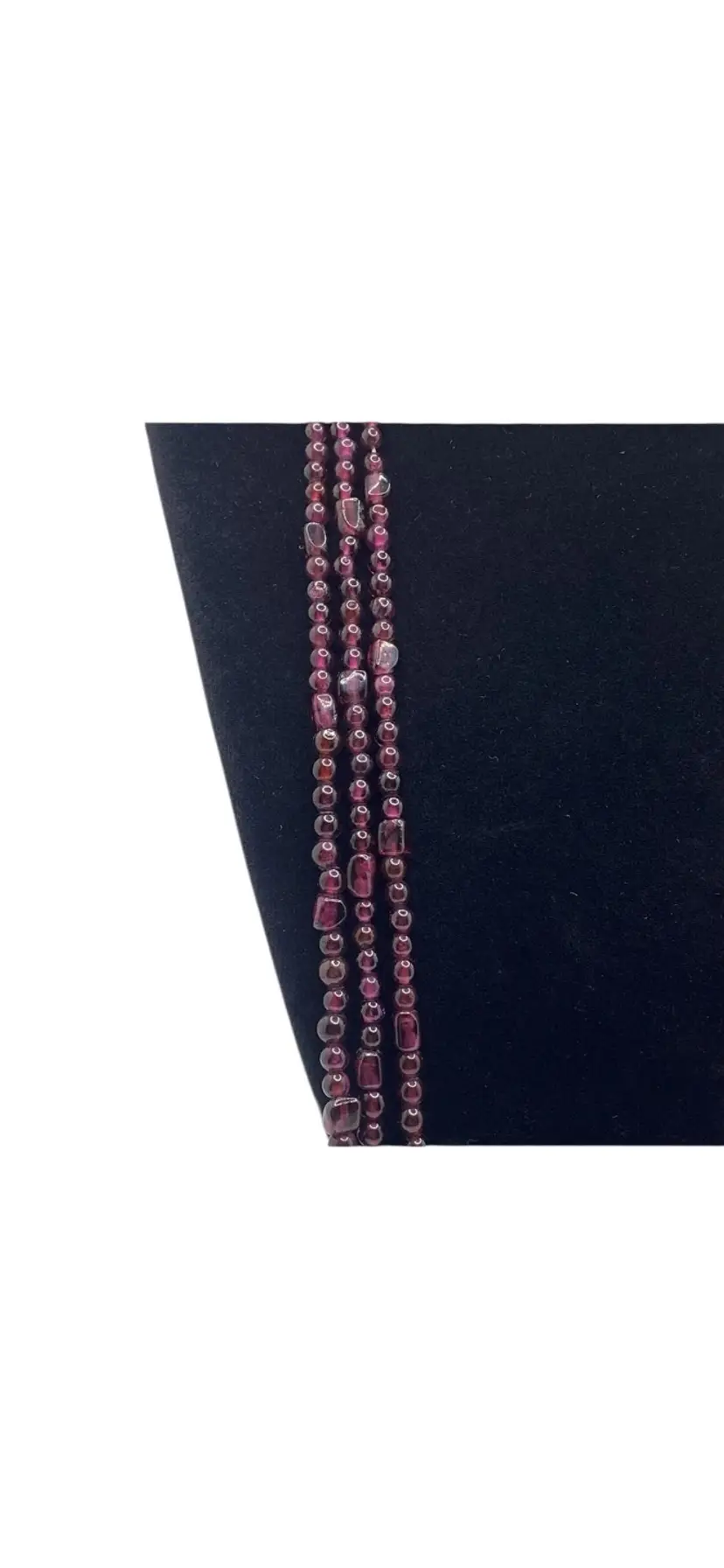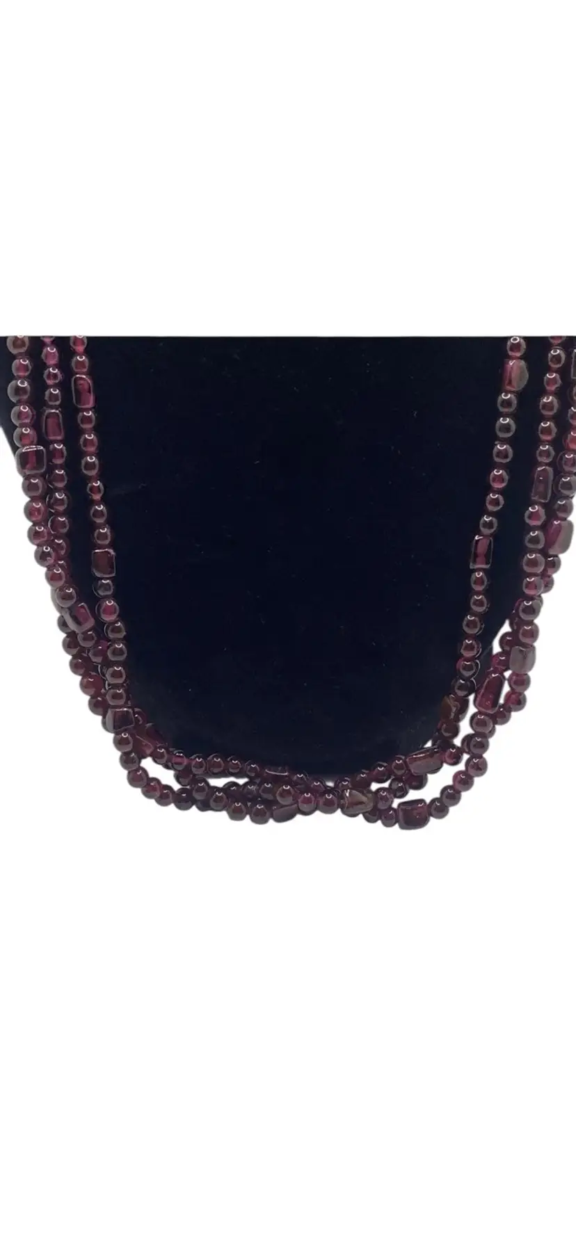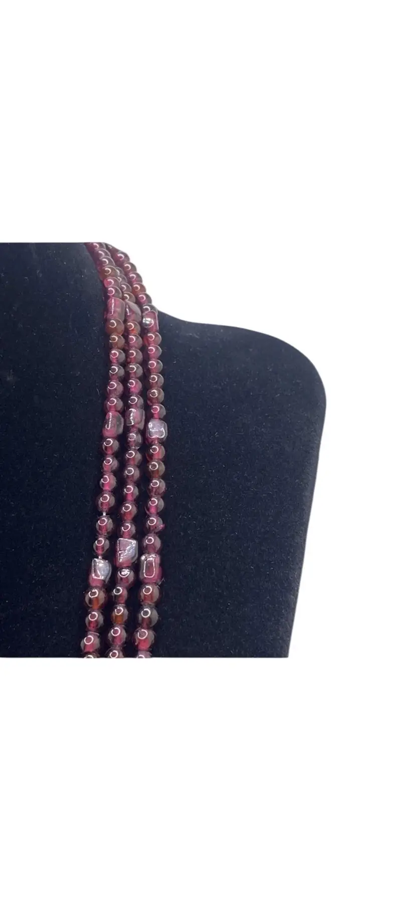 This vintage 22" necklace features three strands of genuine garnet beads in square and round shapes. The necklace has a barrel closure and is in a gold tone metal. It is perfect for various occasions such as Mother's Day, Christmas, graduation, anniversary, birthday, and more. The necklace exudes beauty and timeless elegance, making it a statement piece for any woman's jewelry collection.