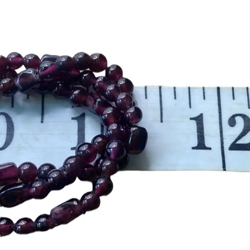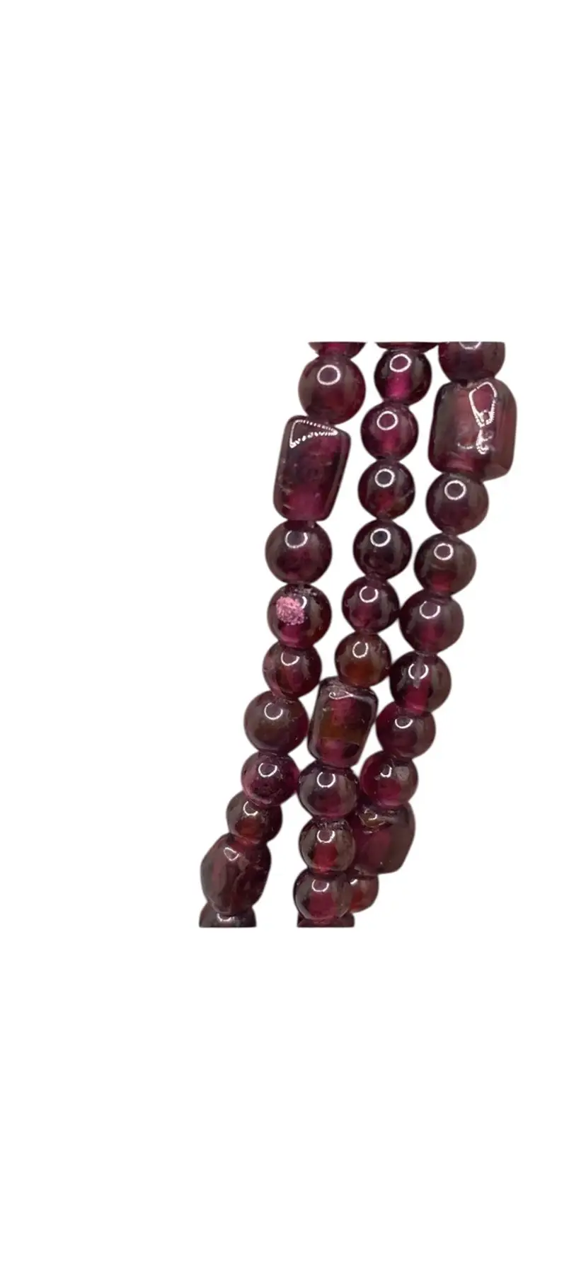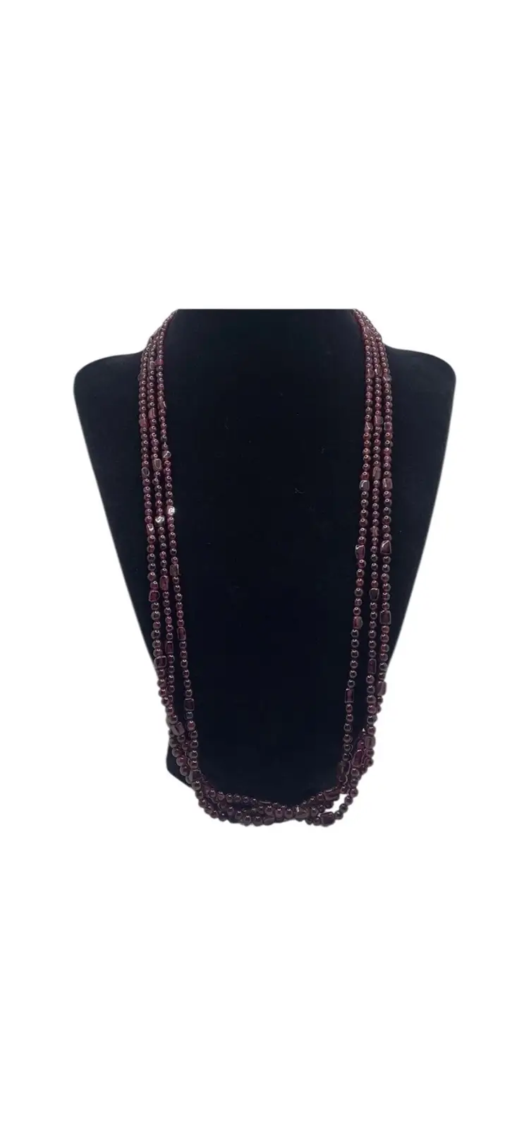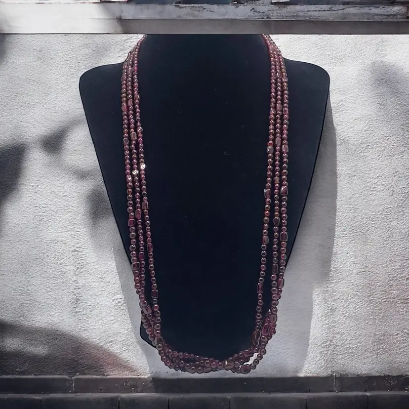 This vintage 22" necklace features three strands of genuine garnet beads in square and round shapes. The necklace has a barrel closure and is in a gold tone metal. It is perfect for various occasions such as Mother's Day, Christmas, graduation, anniversary, birthday, and more. The necklace exudes beauty and timeless elegance, making it a statement piece for any woman's jewelry collection.