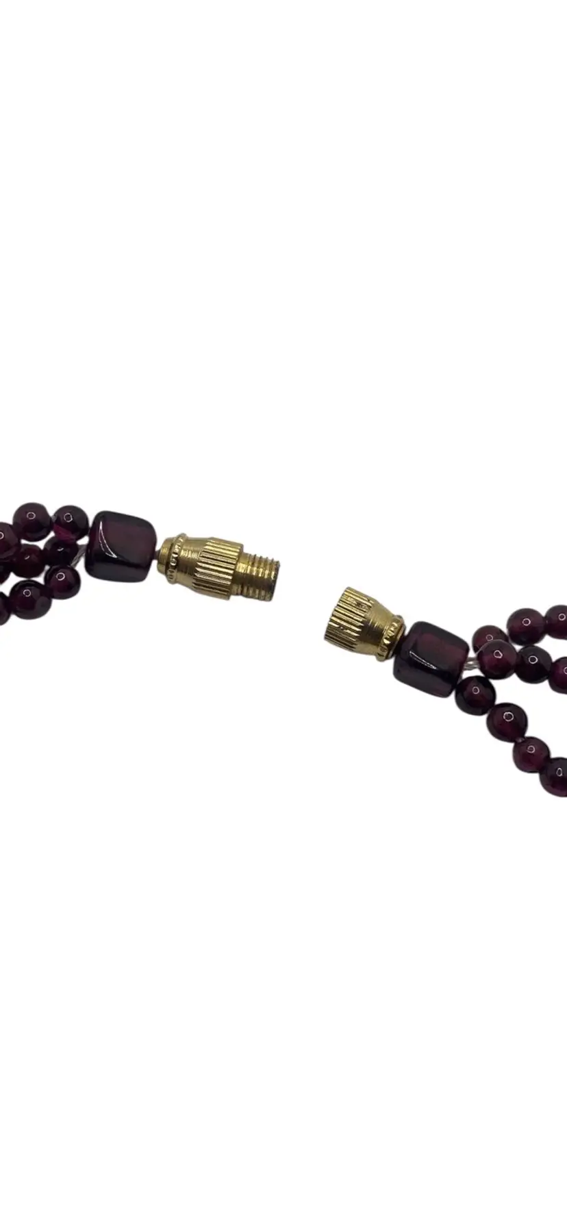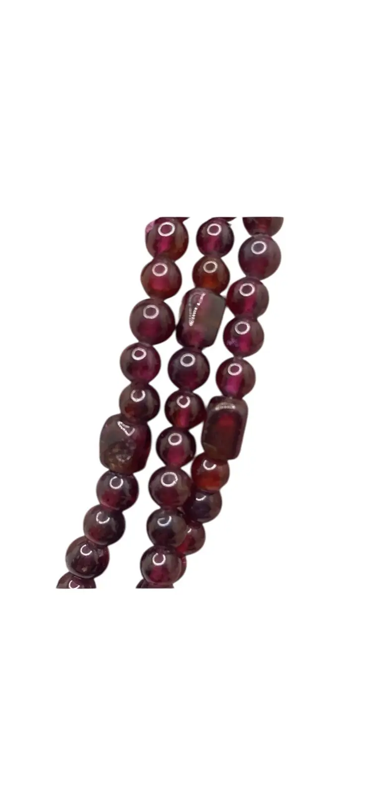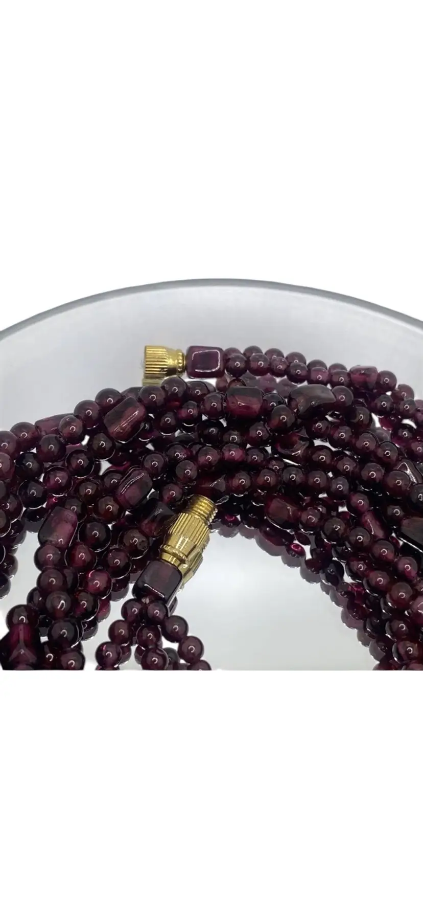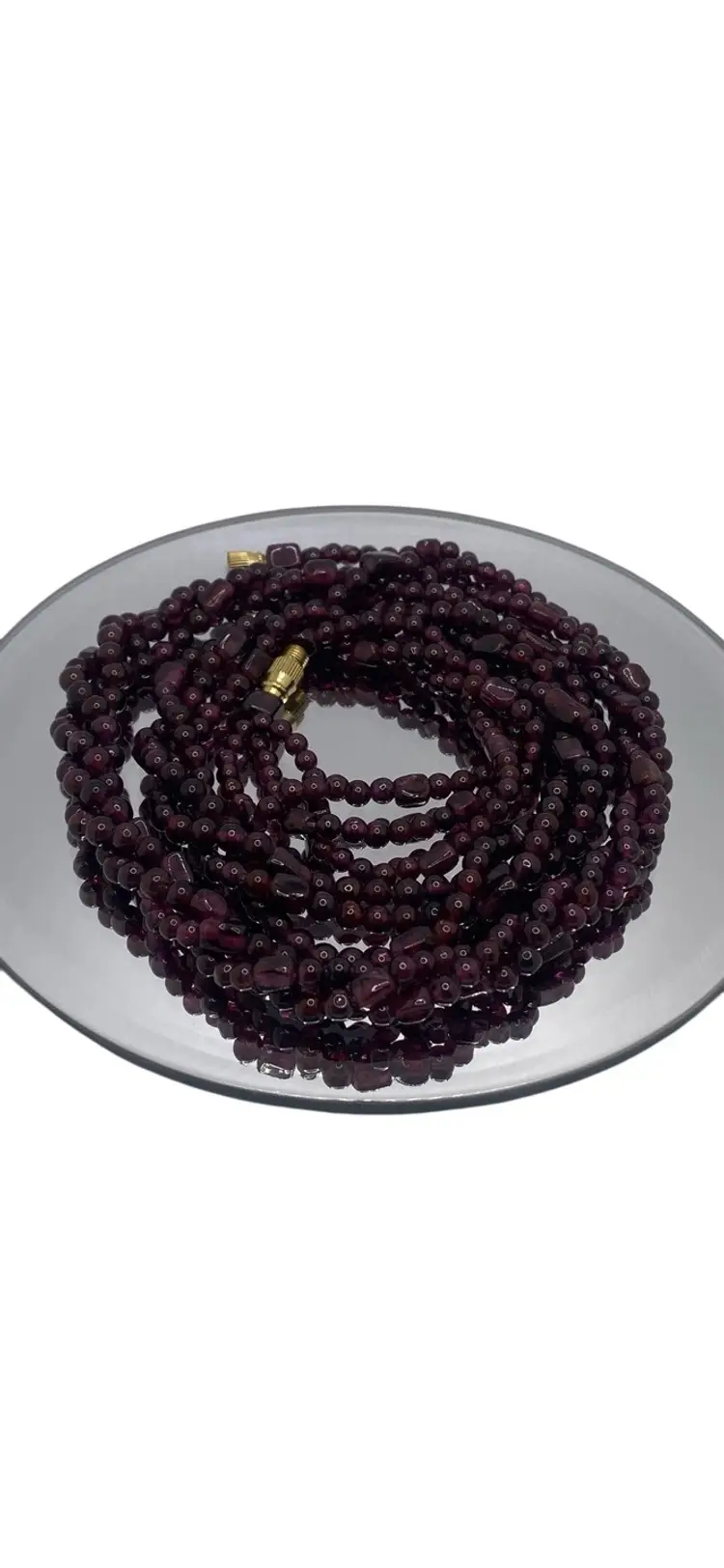 This vintage 22" necklace features three strands of genuine garnet beads in square and round shapes. The necklace has a barrel closure and is in a gold tone metal. It is perfect for various occasions such as Mother's Day, Christmas, graduation, anniversary, birthday, and more. The necklace exudes beauty and timeless elegance, making it a statement piece for any woman's jewelry collection.