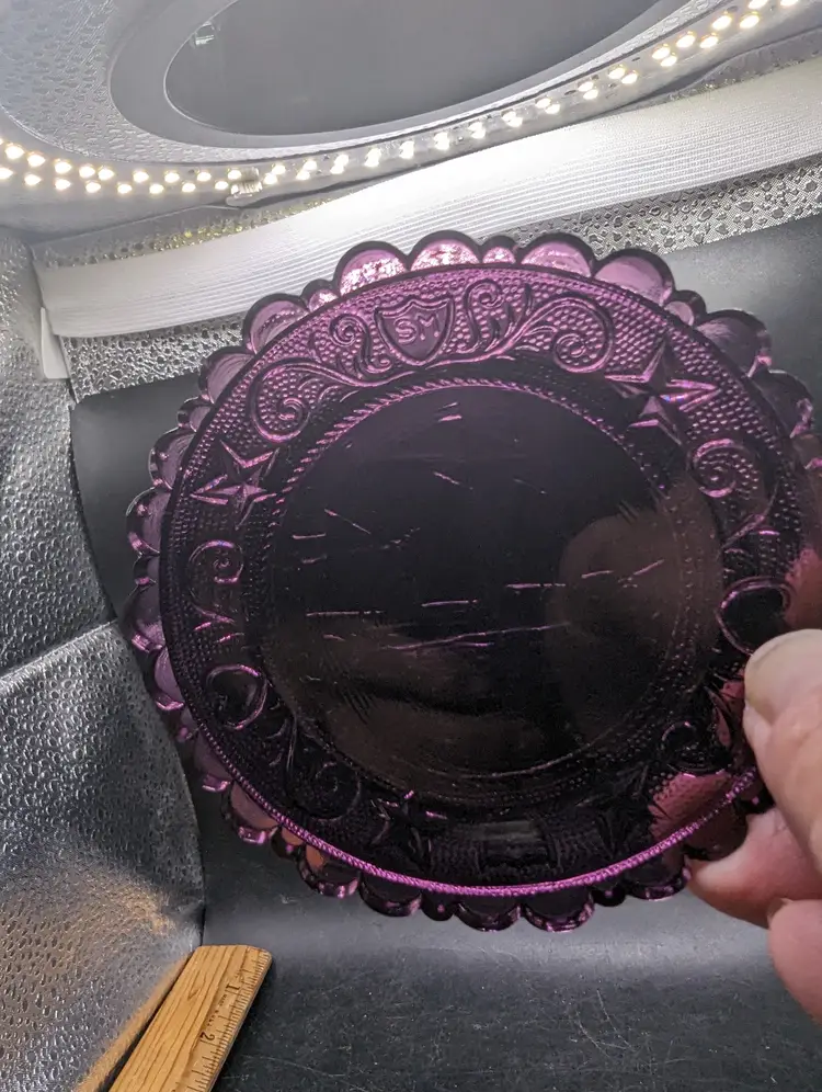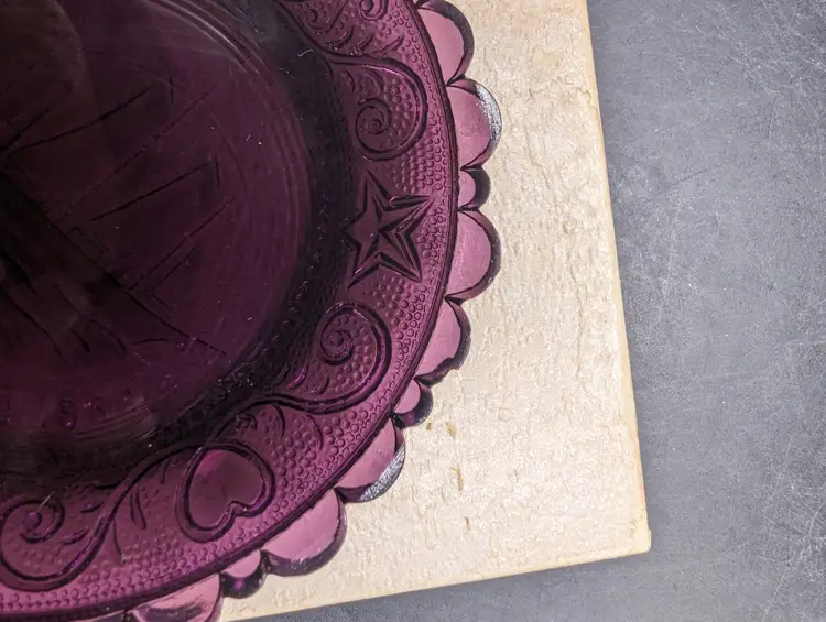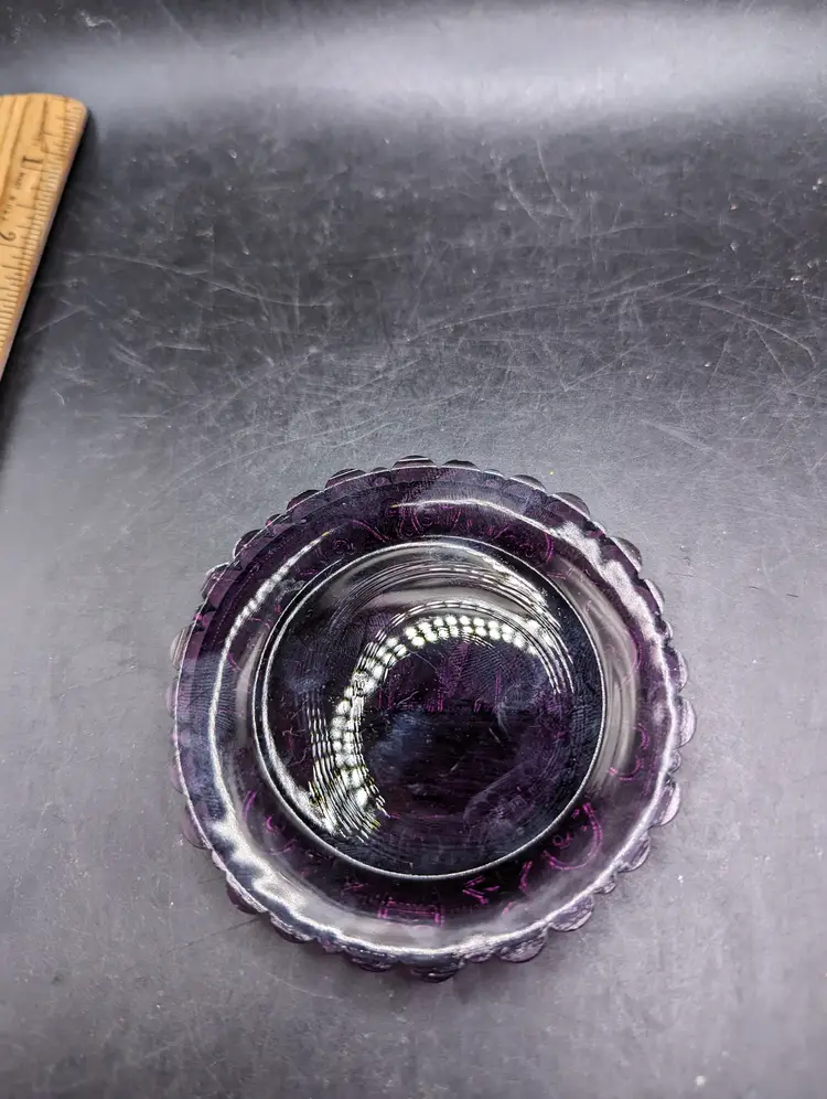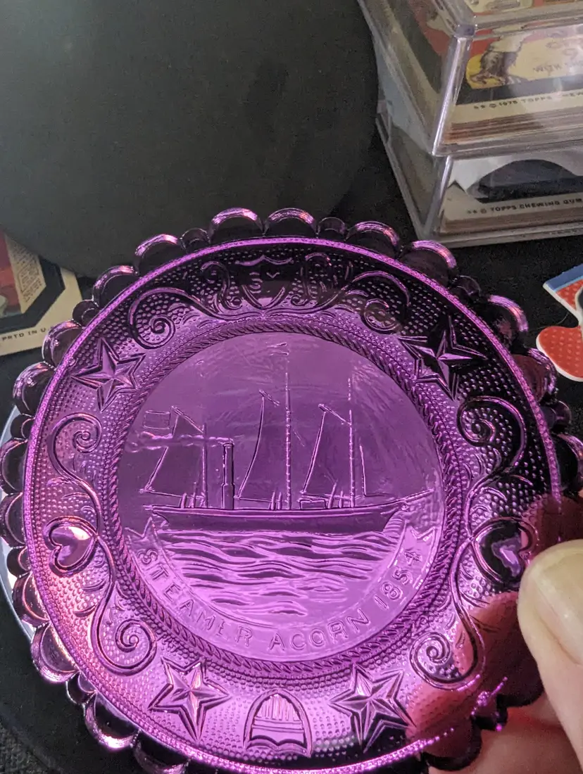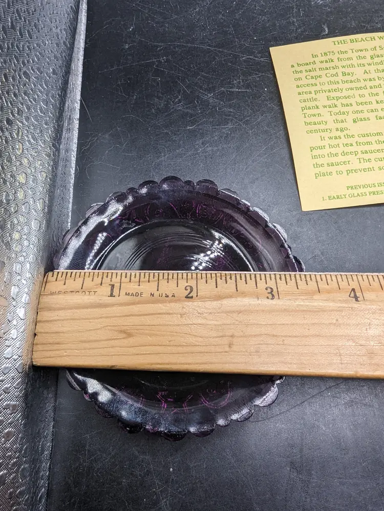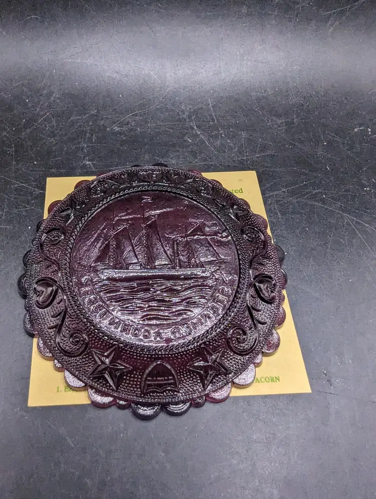 This is a very Nice Vintage Pairpoint Glass Coaster Steamer Acorn. It is done in a deep purple that shows dark pink in the light. There is a chip as seen in last picture. Please see all pictures for condition and measurements.
