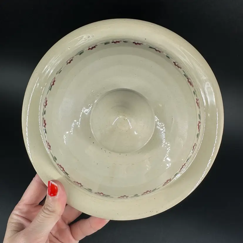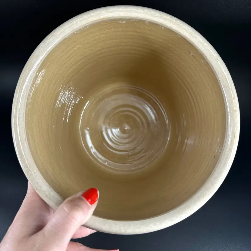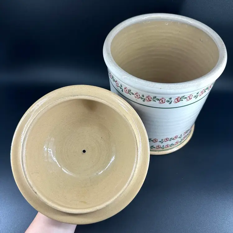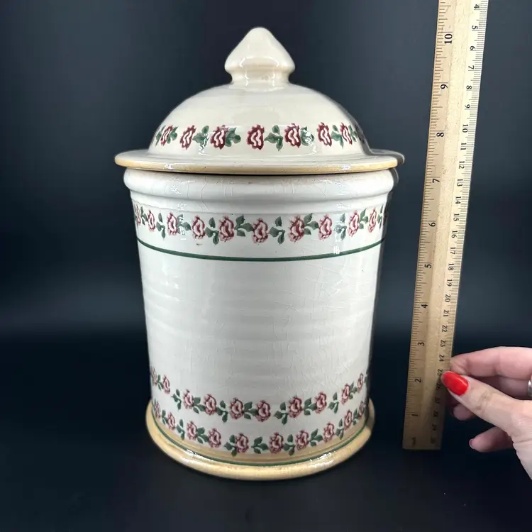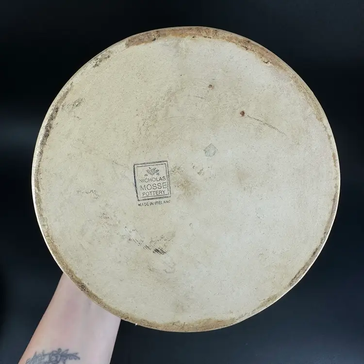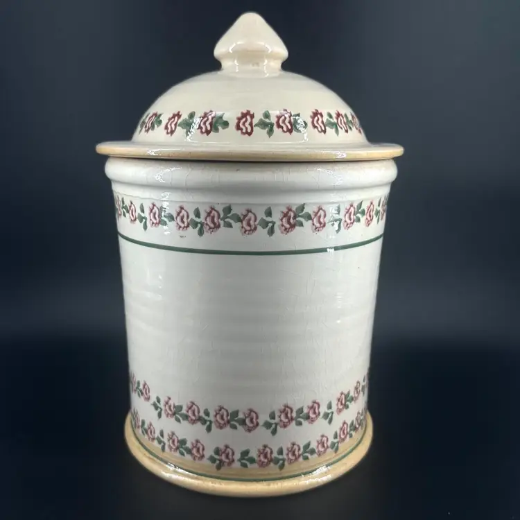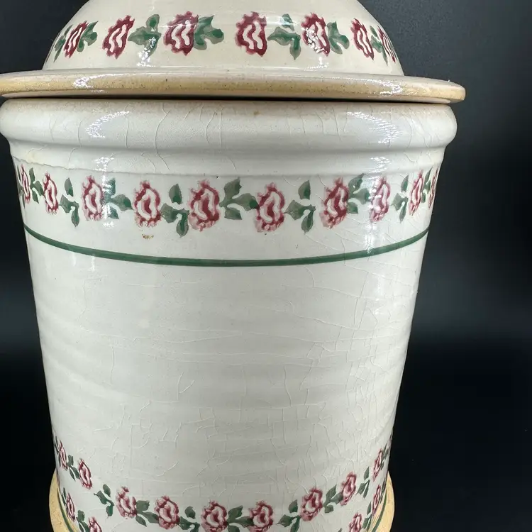 Lidded pottery jar made by Nicholas Mosse, featuring floral banners. No chips or cracks in pottery, but there is crazing in the glaze as can be seen in photos. Bottom of jar has a “NICHOLAS MOSSE” stamp on it. Jar measures approximately 11” tall at top of lid handle.
