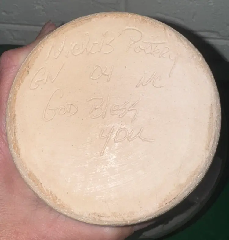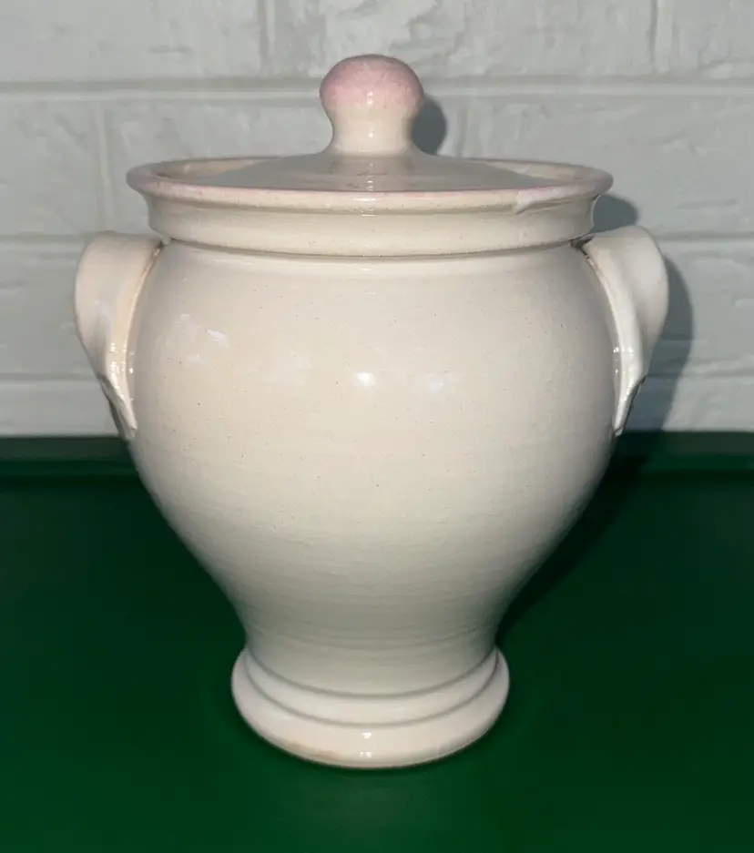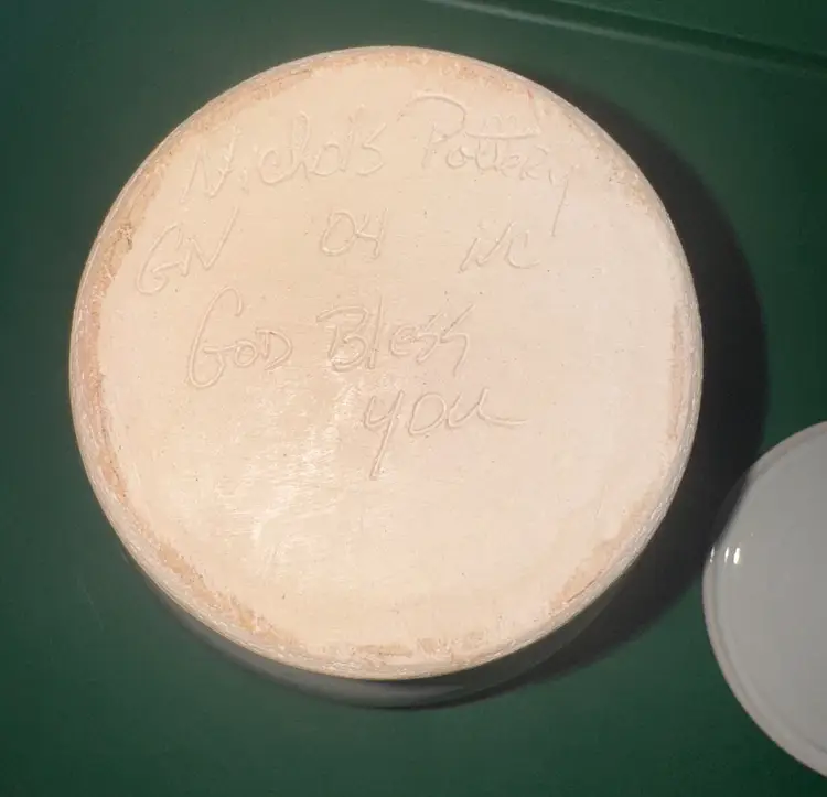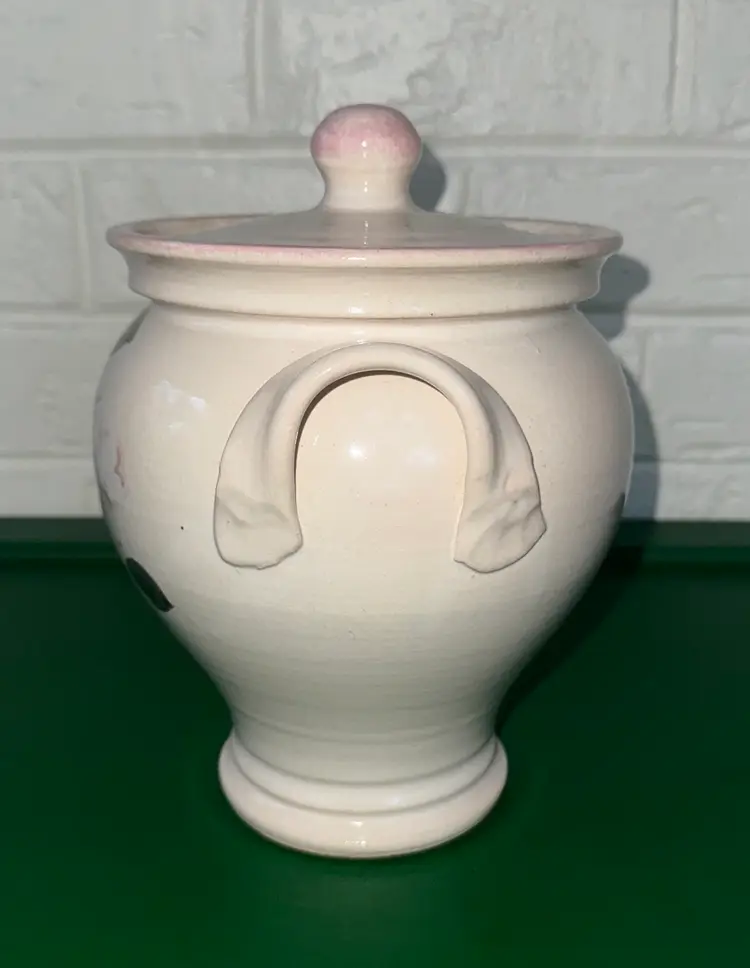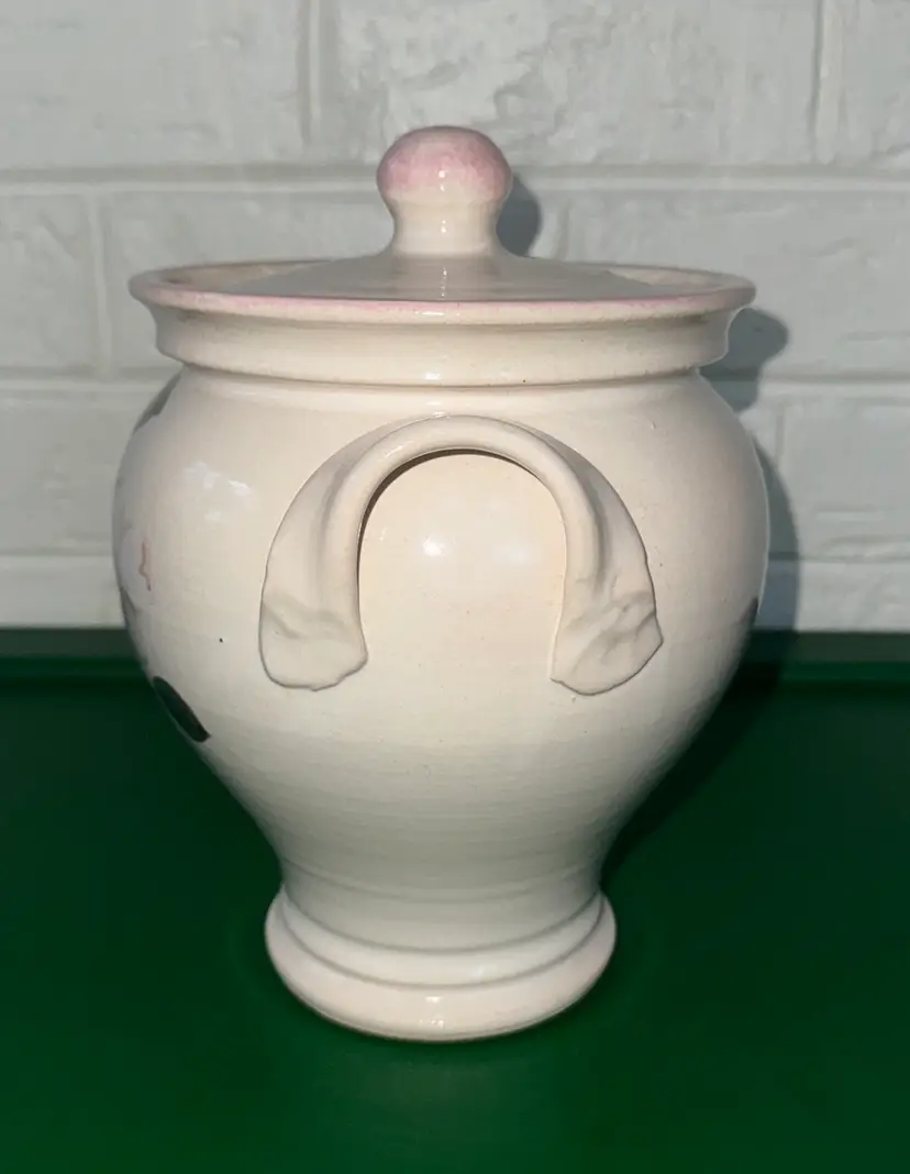 Elegant ceramic jar with floral design. Features a lid and side handles. Perfect for decor or storage. Nichols Pottery N.C. 2004 Floral Cookie Jar with Lid Studio Art Pottery 9” tall 8” wide Signed Excellent like new condition with no breaks or chips (2914264)
