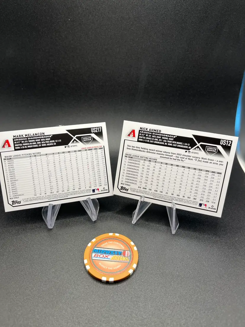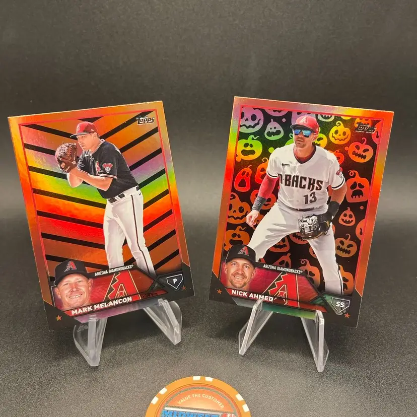 2023 Topps Update Halloween parallel of mark Melacon. And Jack O’Lantern parallel of Nick Ahmed. Print run of Melacon approx 2500. Print run of Ahmed approx 359.