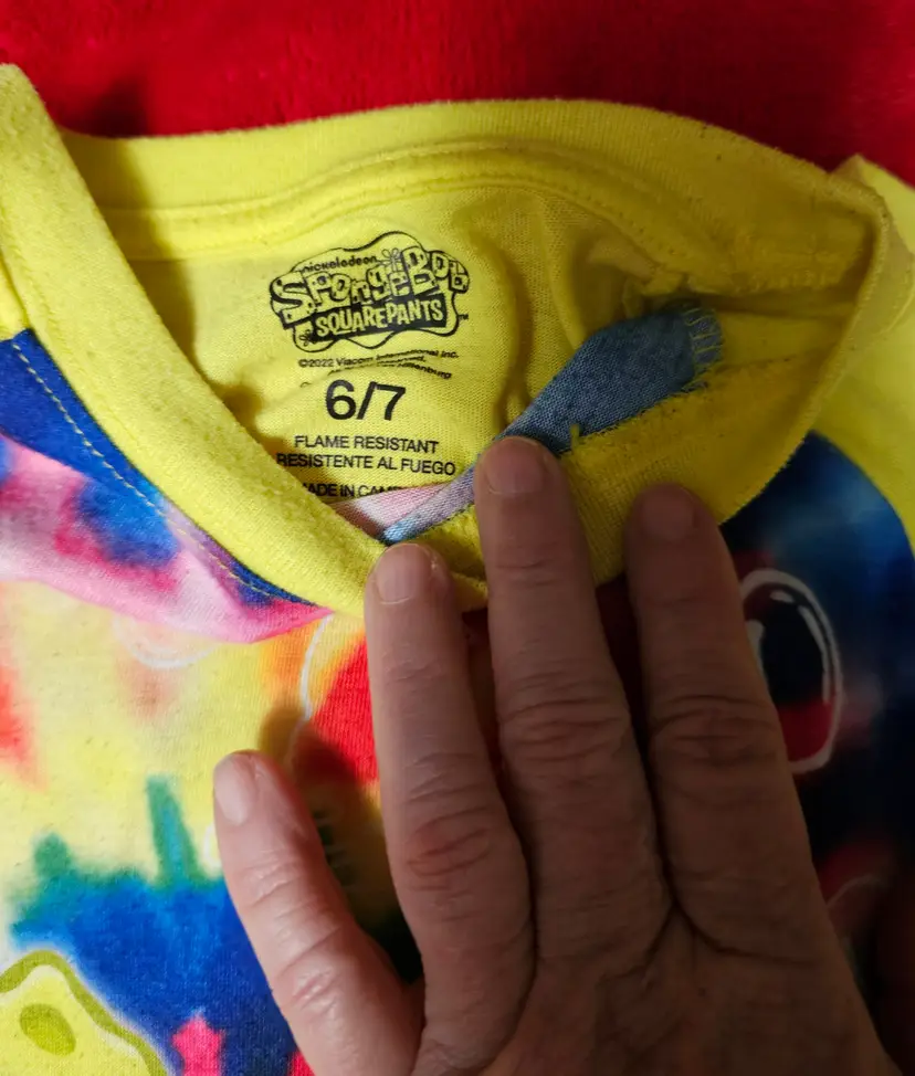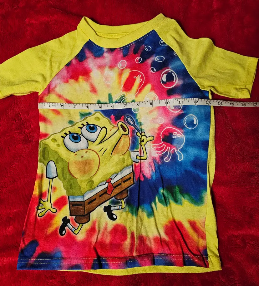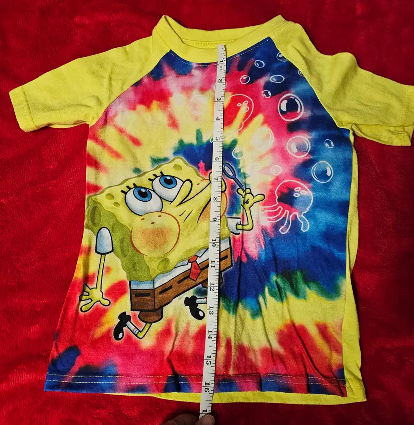 The Nickelodeon SpongeBob SquarePants Pajama Top T-Shirt in size 6/7 is a bright yellow shirt featuring the iconic character SpongeBob SquarePants. Made from lightweight knit fabric, this short-sleeve pullover top is machine washable and perfect for all seasons. With a solid pattern and cartoon theme, this Nickelodeon branded garment is ideal for young boys who love the classic TV show. The shirt is part of the SpongeBob SquarePants character family and is a great addition to any child's sleepwear collection.