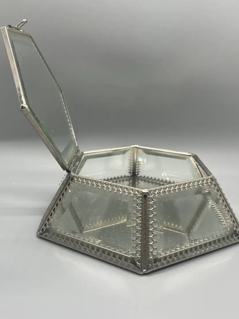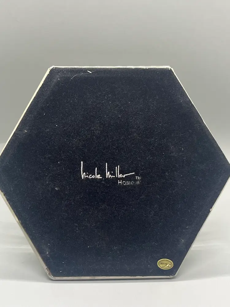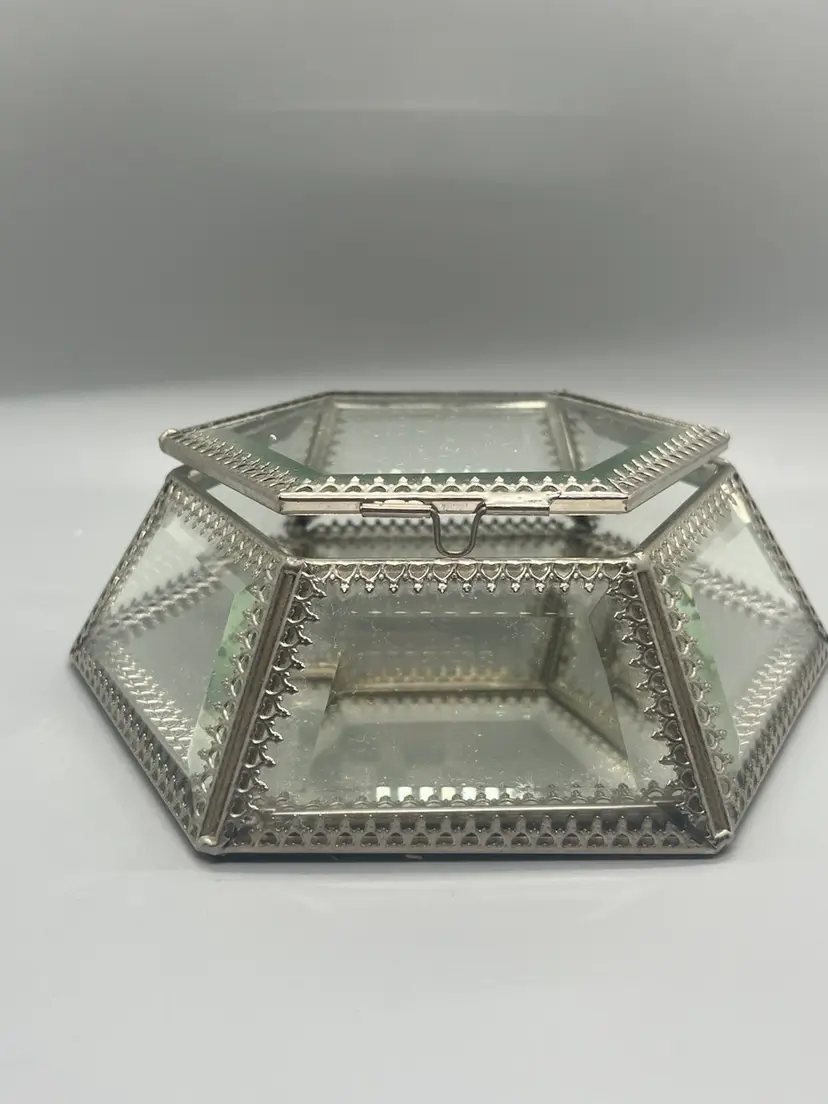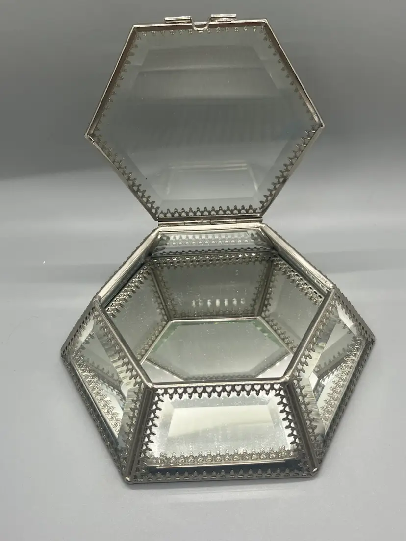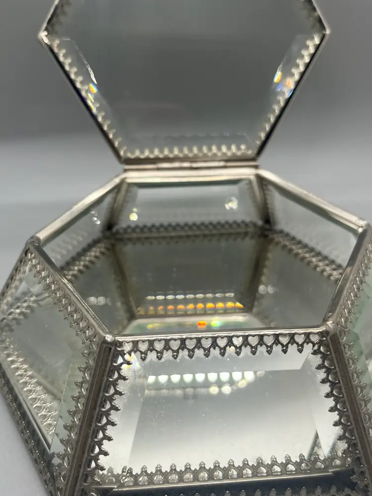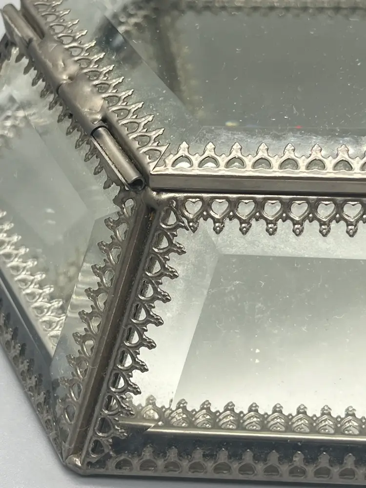 Beautiful Nicole Miller trinket box all glass with a mirrored bottom to showcase your special treasures. Vintage look in excellent condition