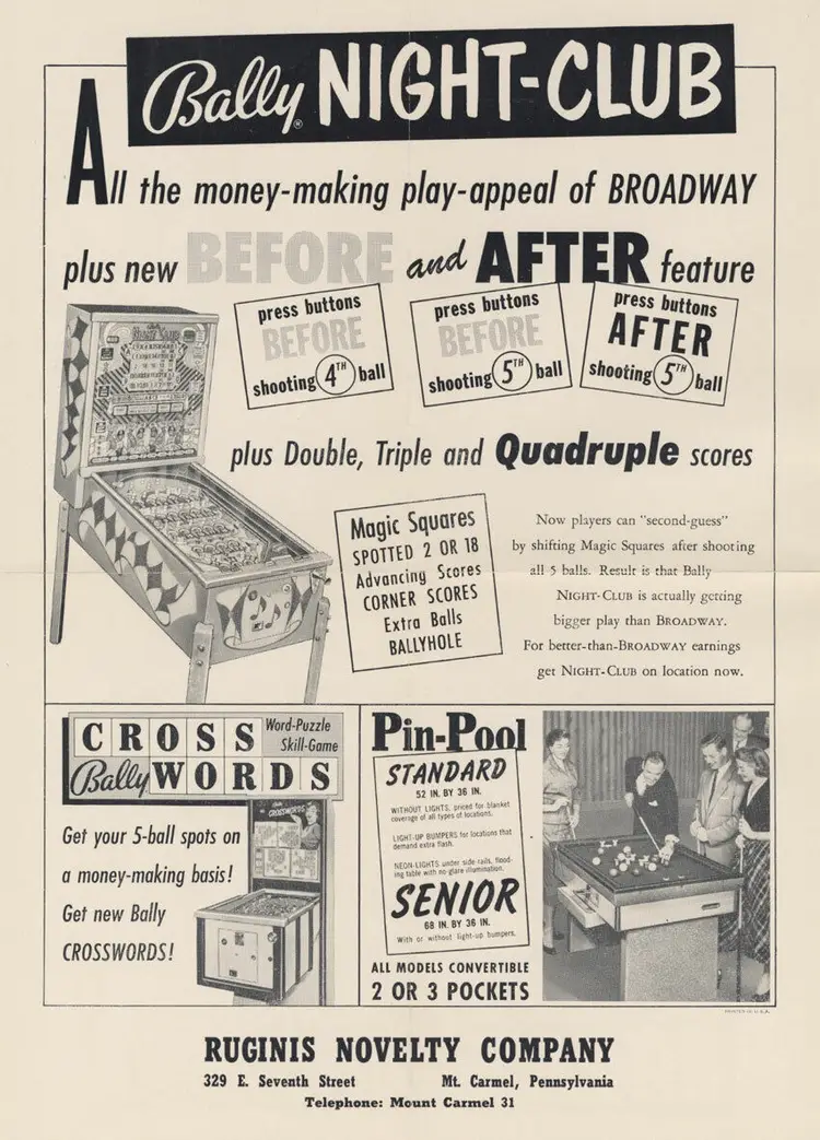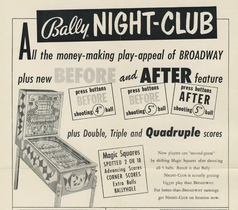 Model: Night Club Pinball: Flyer Modified Item: Yes Country/Region of Manufacture: United States Year: 1956 Modification Description: Factory folded. Brand: Bally