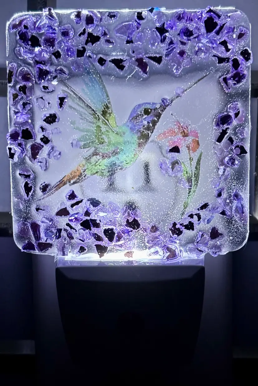 Purple glass with humming bird & flowers. One of a kind, hand crafted by me.