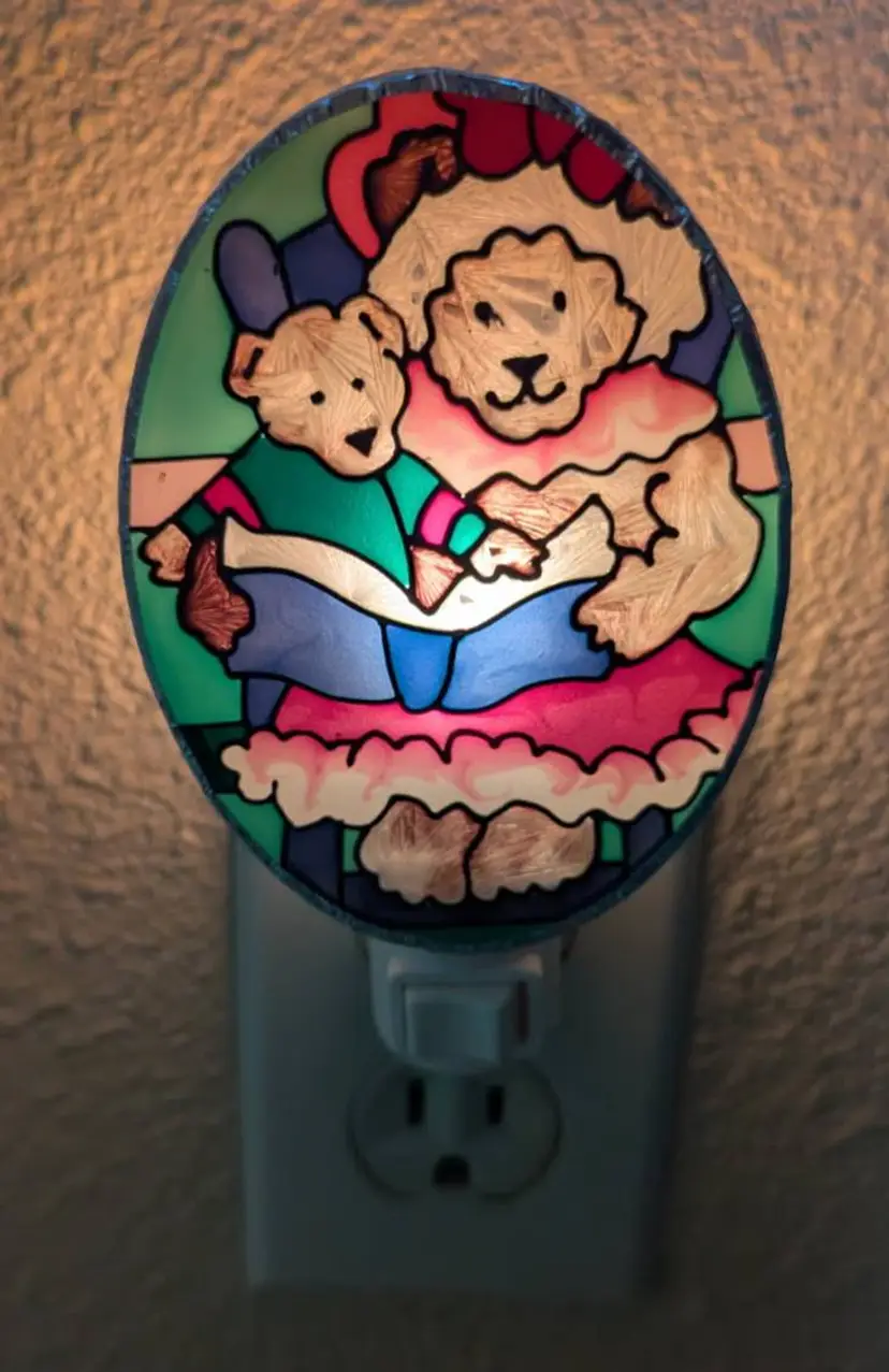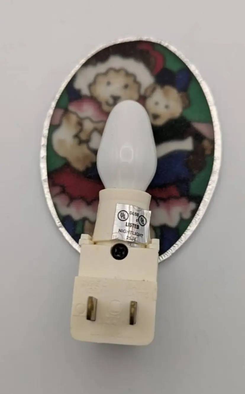 This is a real sweet nightlight hand painted by Joan Baker Designs. It is of a Mother Bear reading a book to her child bear. The oval designed light piece measures: 3.75 inches long by 2.75 inches wide. Please see photos, and ask any questions. Thanks so much for looking! This is being sold as used. It was briefly in child's room. No chips or cracks. Light bulb works well. Non smoking home. Please see photos .