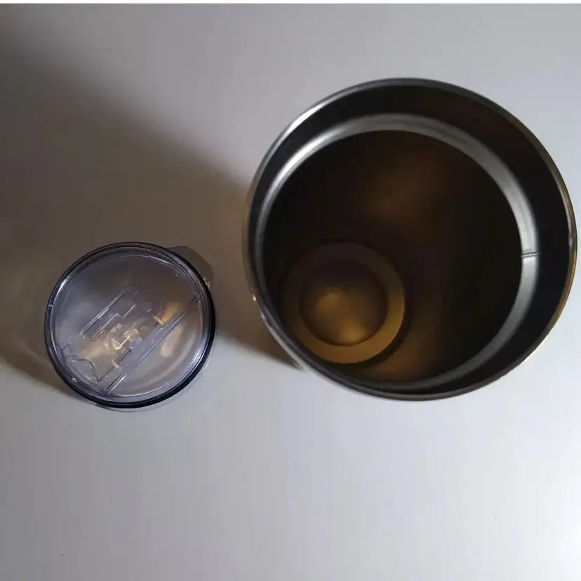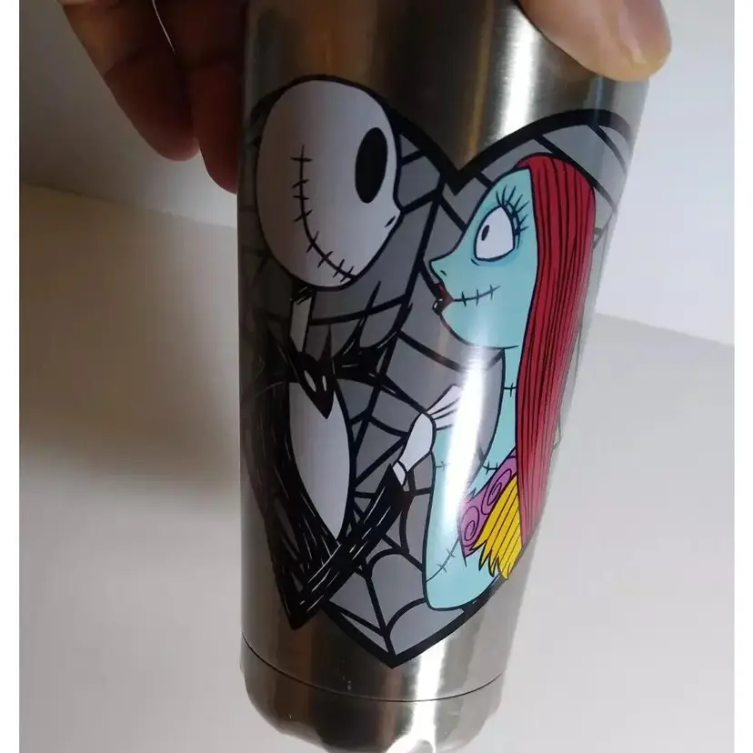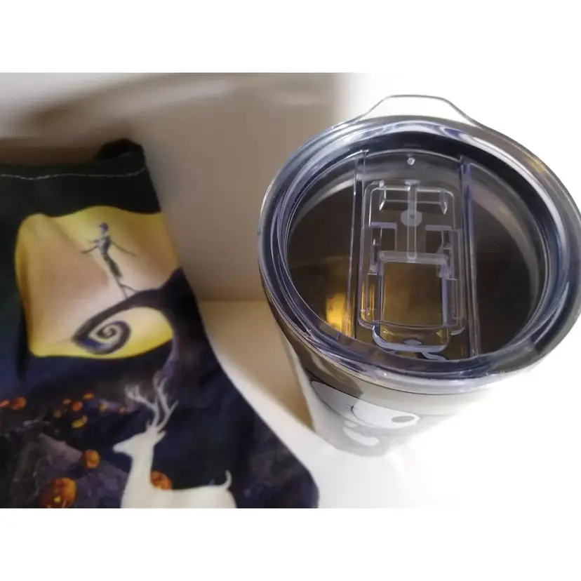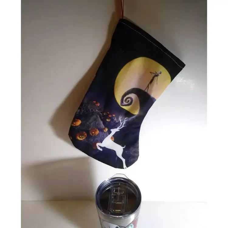 1- Stainless steel tumbler made by Ningbo China. Size is 6.25" tall. Has plastic snap on lid. Nice condition. 1- Cloth fabric Christmas stocking. Size is 11". Good used condition.
