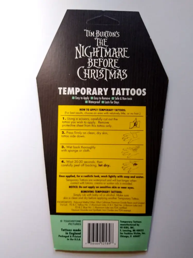 This Nightmare Before Christmas collectible card features Sally, scarecrow, and other graphics. temporarily tattooed onto a tombstone graphic header card. A Touchtone Pictures product, manufactured in the United Kingdom in 1993. The card is multicolored and features the iconic Disney franchise character. This item is perfect for any fan of the Nightmare Before Christmas franchise or Disneyana collectors. It is a unique addition to any collection and is sure to be a conversation starter. Get your hands on this rare piece of memorabilia today! UNUSED old stock