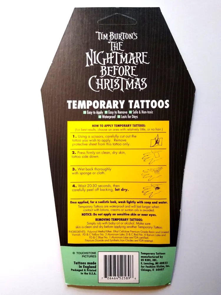 This Nightmare Before Christmas collectible card features weapons, skull, axe, and other graphics. temporarily tattooed onto a tombstone graphic header card. A Touchtone Pictures product, manufactured in the United Kingdom in 1993. The card is multicolored and features the iconic Disney franchise character. This item is perfect for any fan of the Nightmare Before Christmas franchise or Disneyana collectors. It is a unique addition to any collection and is sure to be a conversation starter. Get your hands on this rare piece of memorabilia today! UNUSED old stock. Has some corner creases.