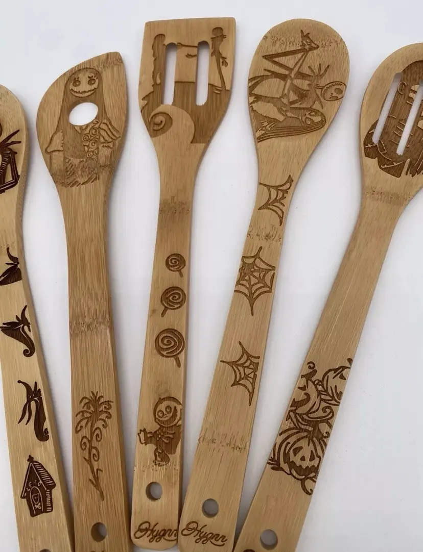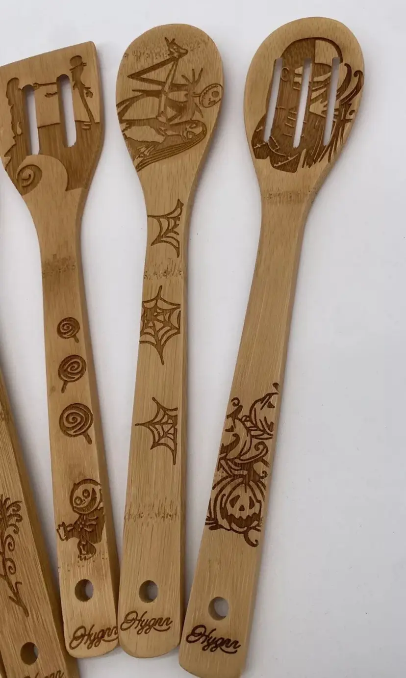 Nightmare Before Christmas Wooden Spoon Set Woodburned Designs Set of 5 Hygrr Brand. Great condition.