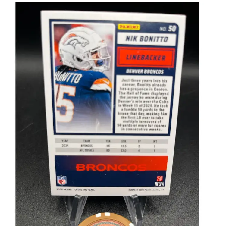 2025 Score Nik Bonitto gold #38/50. Denver Broncos sack leader in 2024.