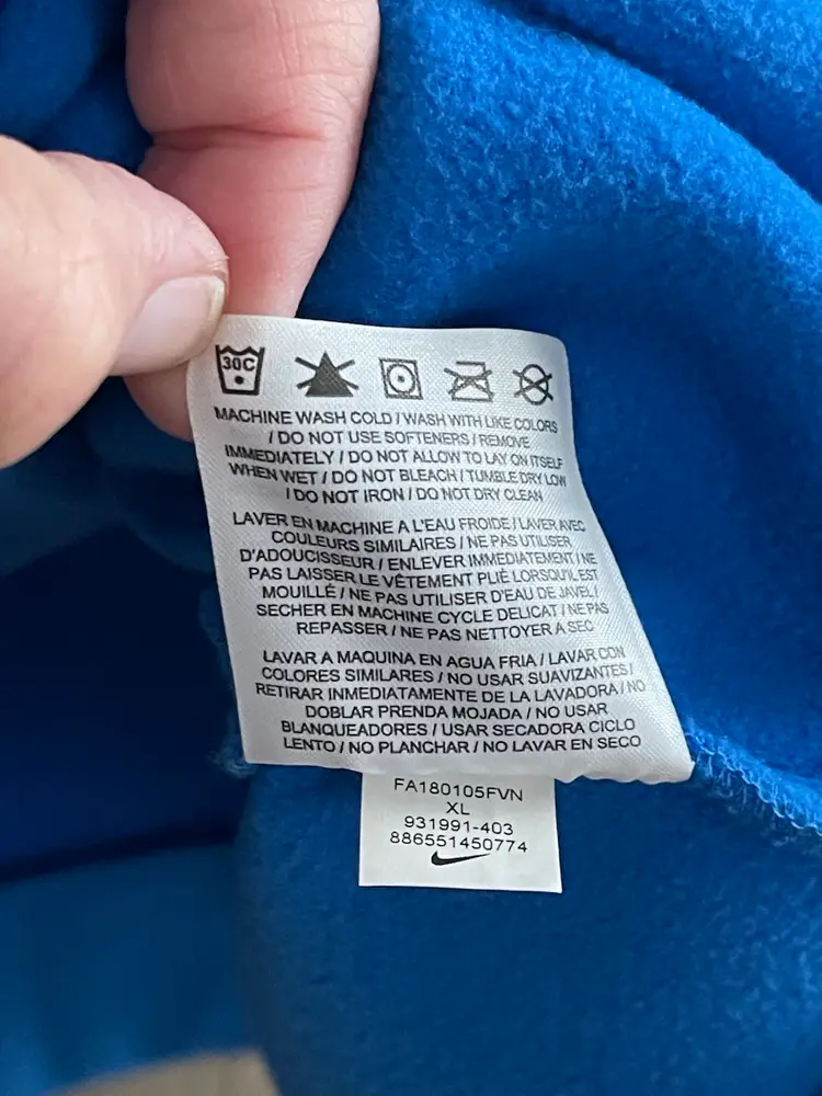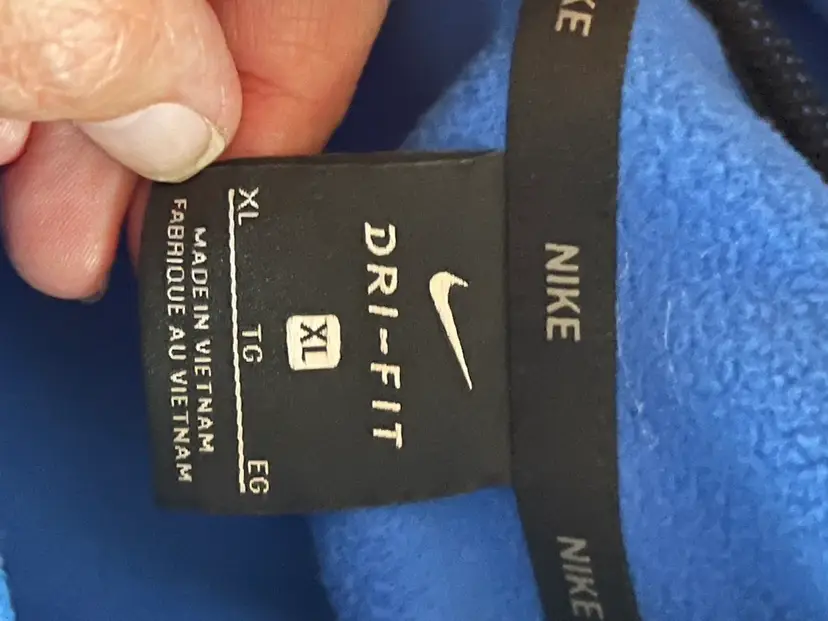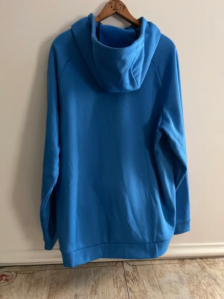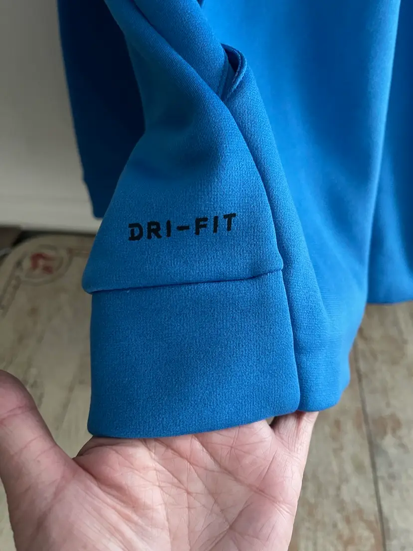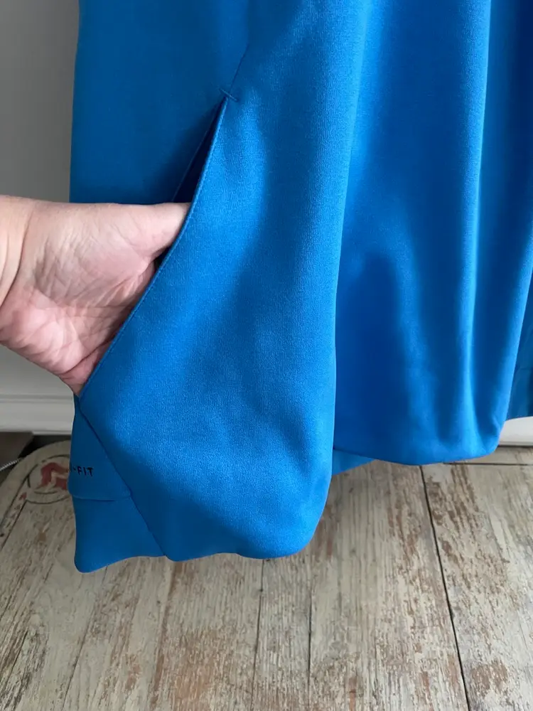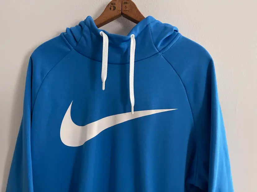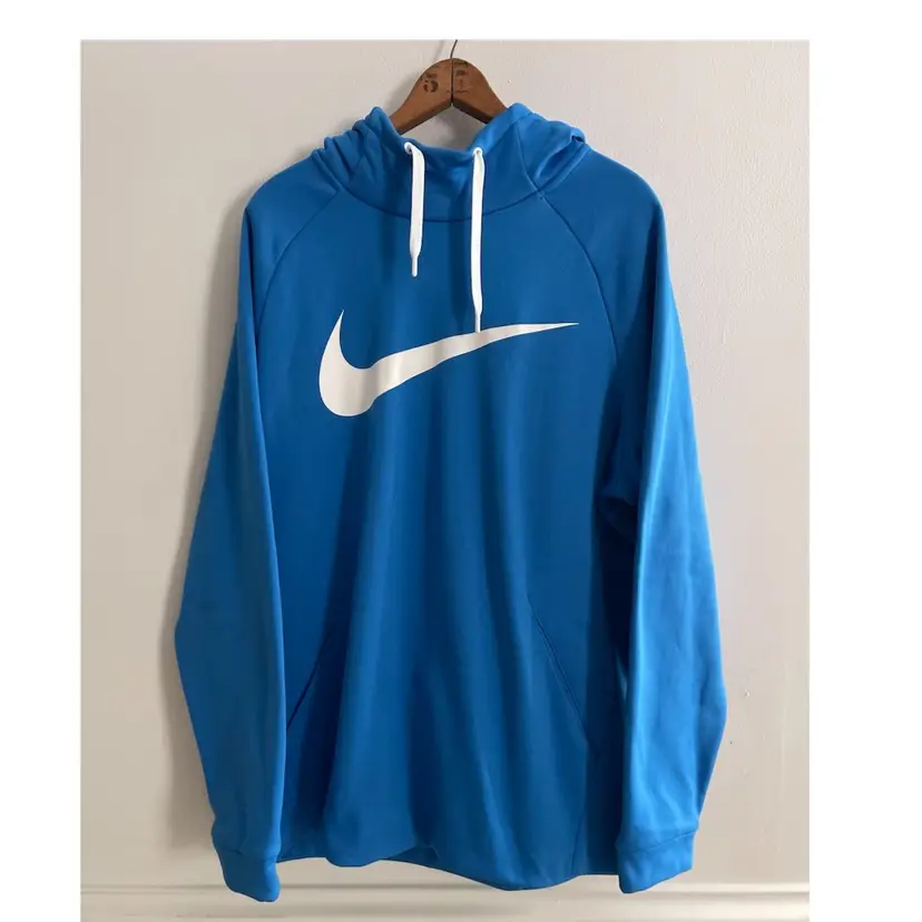 Nike Dri Fit Performance Hoodie Game Royal Blue Mens XL Kangaroo Front Pocket Hood with Drawstring High Neckline Flat Front Hemline White Big Center Swoosh 100% Polyester Dri-Fit Fleece Fabric