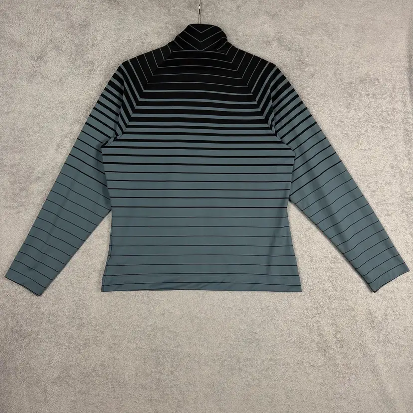 Color: Dark green and black horizontal stripe pattern with a gradient effect from solid black shoulders to green lower body and sleeves.