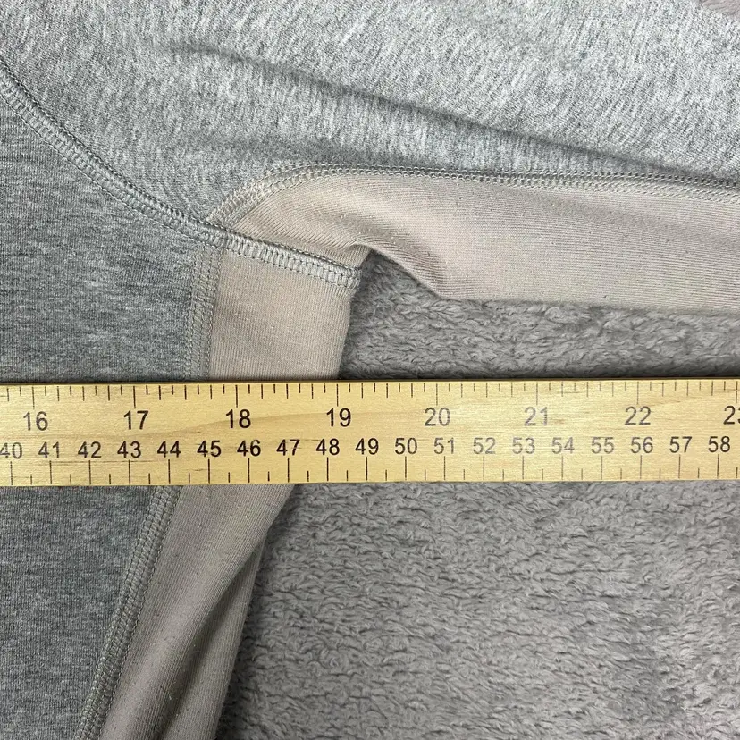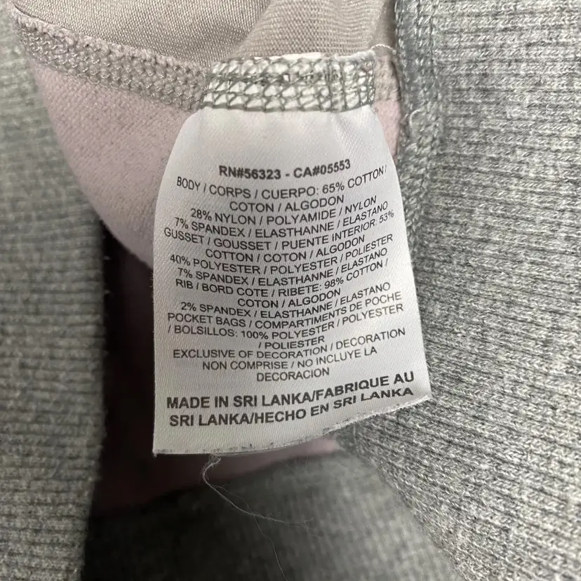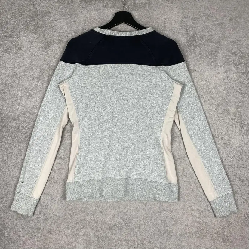 Color: Heather gray body with navy upper yoke and light beige side panels and under-sleeve panels.