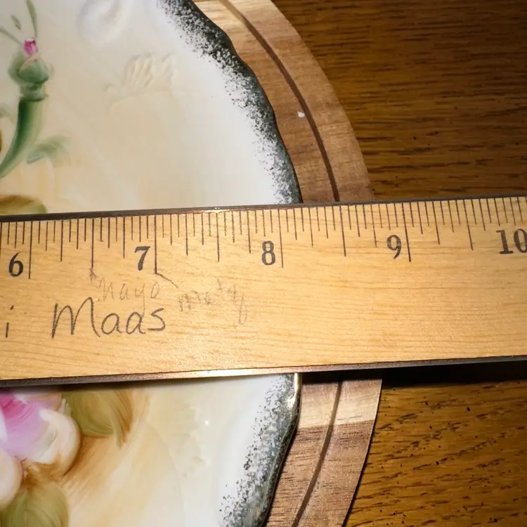 This item is a vintage hand-painted porcelain decorative plate, made in Japan, featuring a floral design of yellow and pink roses with a gold-trimmed, ruffled edge. Similar plates were often produced in the mid-20th century by companies such as Norleans, Ucagco, or Enesco. The plate displays a central arrangement of hand-painted white, yellow, and pink roses surrounded by green leaves and buds. The artwork typically extends over an off-white or cream background, which fades into warmer, shaded tones. It has an embossed or raised pattern around the rim with a scalloped, ruffled, and gilded edge. While specific maker's marks vary and are sometimes absent or worn, this style is characteristic of import porcelain from Japan, often dated to the 1940s-1970s