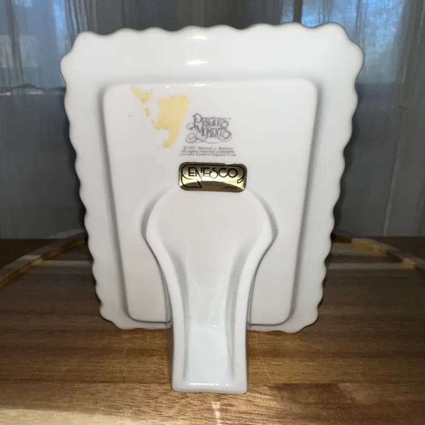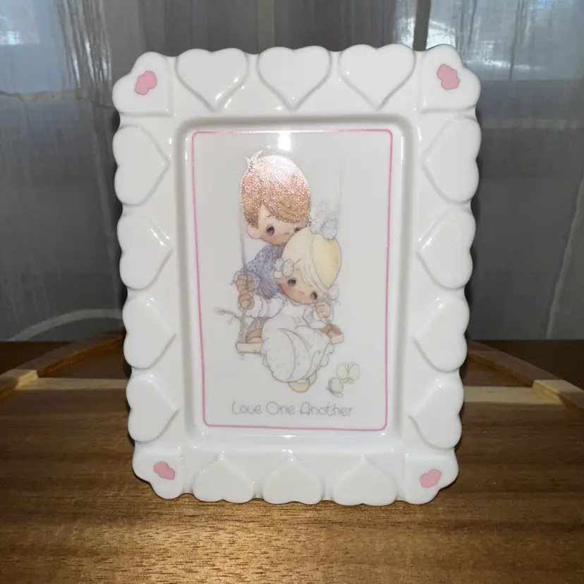 This is a vintage Precious Moments porcelain mini plaque or desk frame featuring the illustration "Love One Another". The illustration depicts a young boy pushing a young girl on a swing. The item was likely manufactured by Enesco and dates from the late 1980s or early 1990s. Precious Moments items are a popular line of collectibles known for their sentimental themes and depictions of children. The phrase "Love One Another" is a common theme found on various Precious Moments products, including figurines and plates.