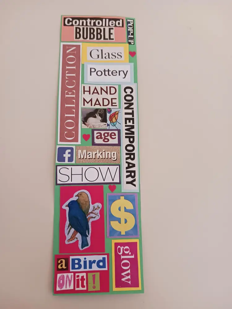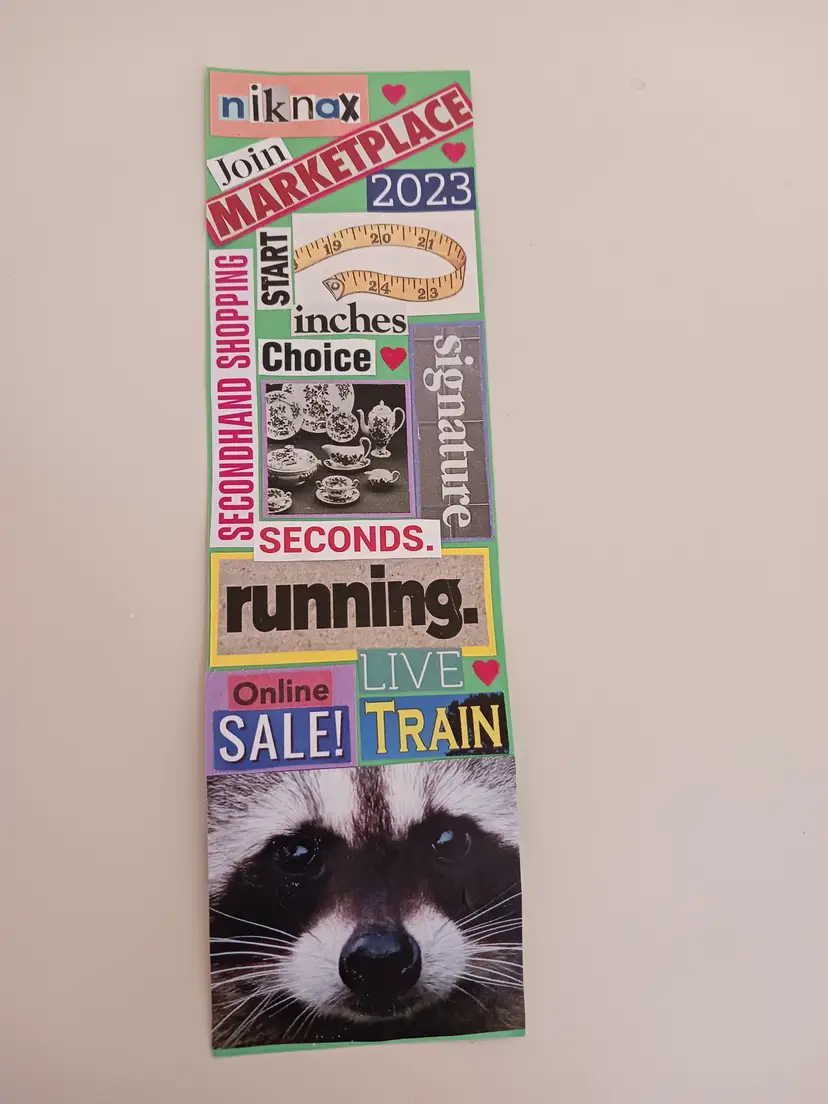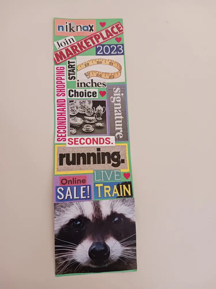 I create bookmarks and vision boards from words and pictures cut out of magazines. Some of the magazines date back to the 1940s! It is my goal to use only recycled found materials, and not buy anything. Occasionally I can't find a word, like NikNax, and have to cheat and type it and print it out.