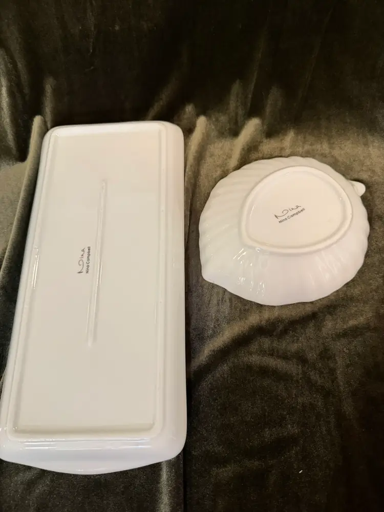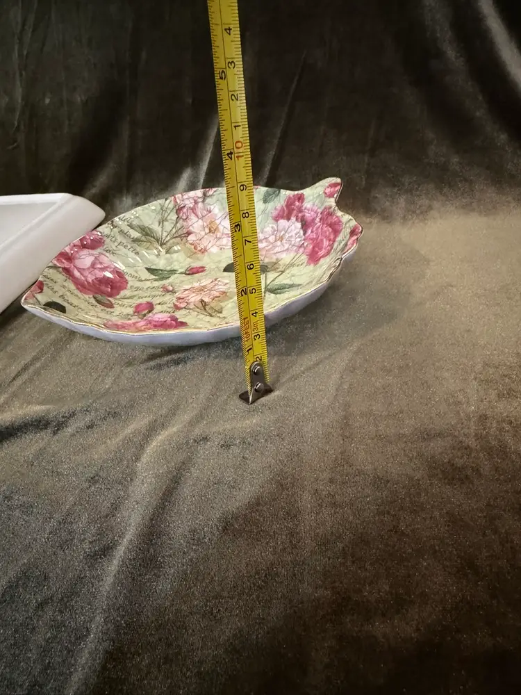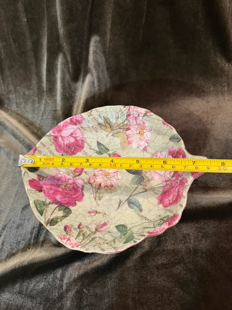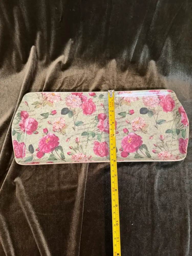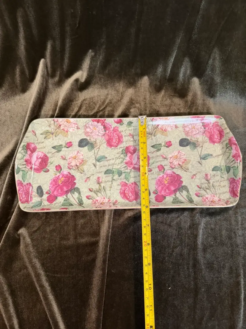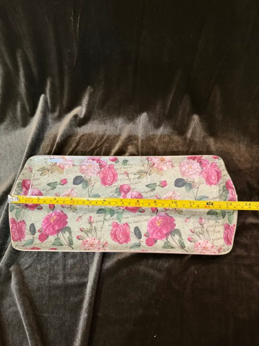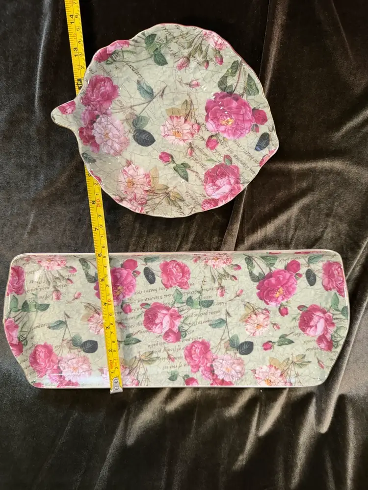 A two-piece designer serving set by Nina Campbell featuring a romantic pink rose and script pattern with a distinctive faux-crackle finish.
