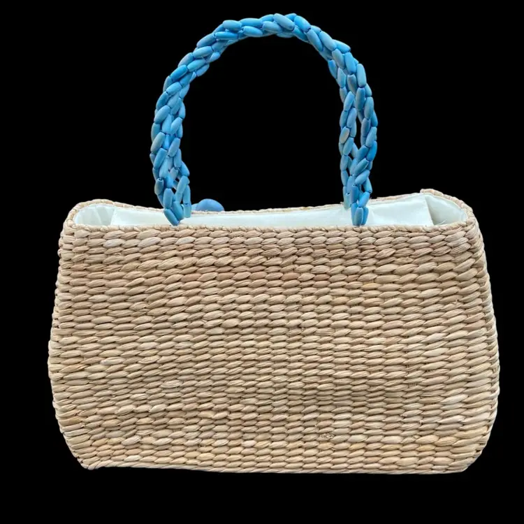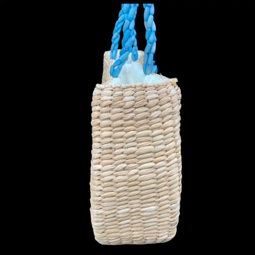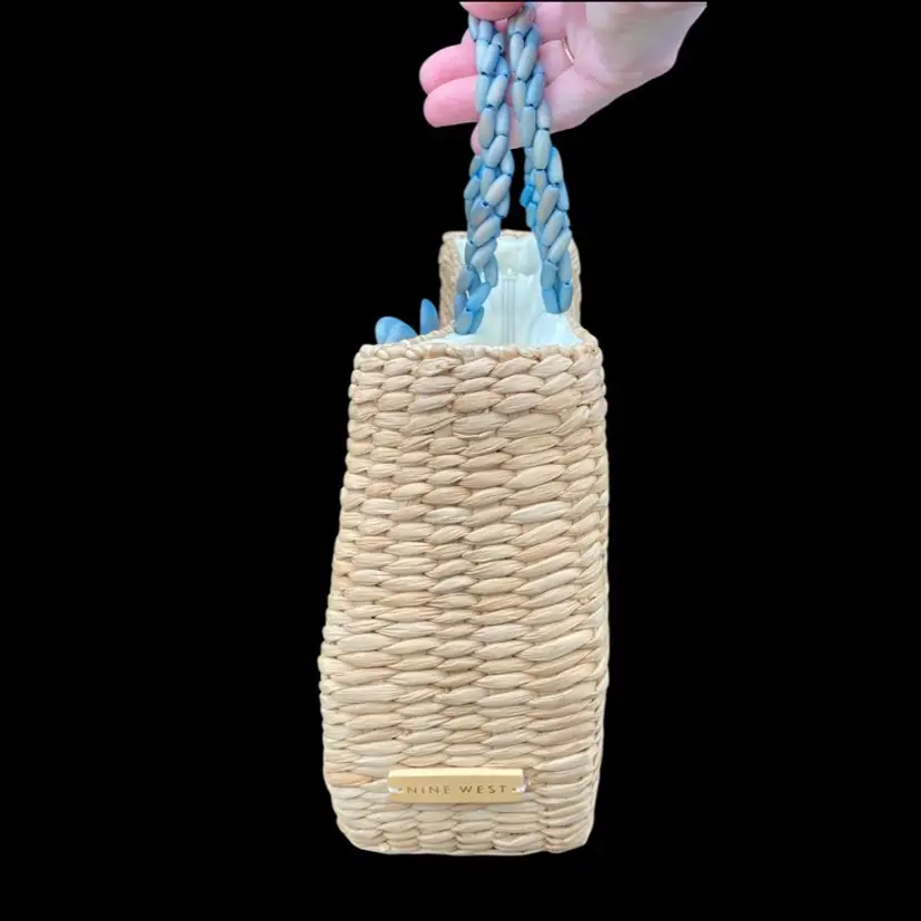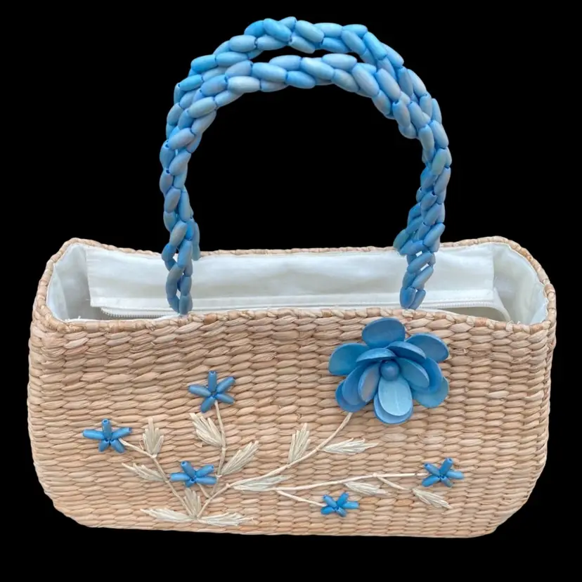 Crafted with a passion for detail, this Nine West Straw Purse marries functionality with a touch of spring/summer. Its woven straw exterior exudes a warm, earthy charm, complemented by smoky blue beaded flower accents and a large wooden appliqué flower that add a whimsical flair. The medium-sized purse measures 13.5 inches in height, 13.3 inches in length, 4.2 inches in width, and 8 inches in depth, providing ample space for your essentials. The purse features a rectangle shape, a secure zip closure, and double woven beaded handles in with a 5-inch drop, ensuring comfort and ease of carrying. The interior is lined with soft cream cotton, safeguarding your belongings from scratches. This handbag is a blend of Filipino craftsmanship and classic style, making it a timeless addition to any wardrobe.