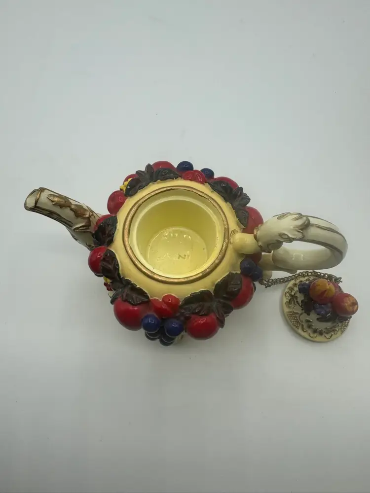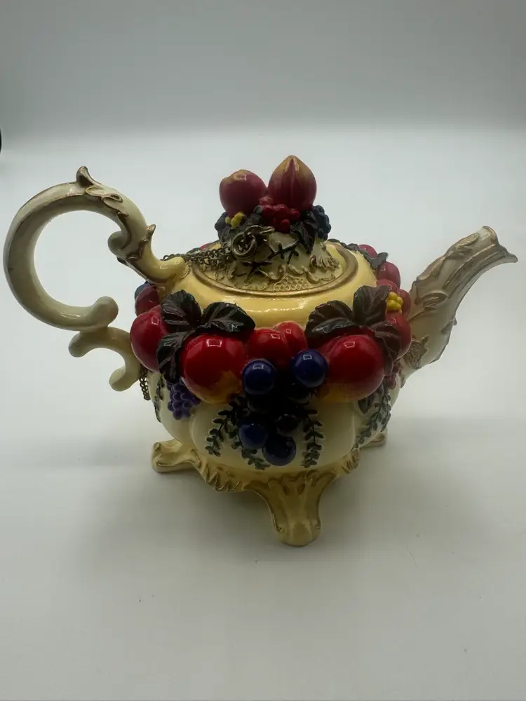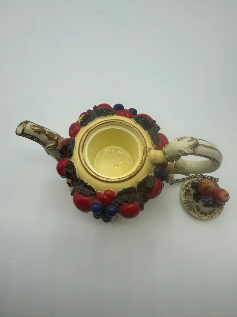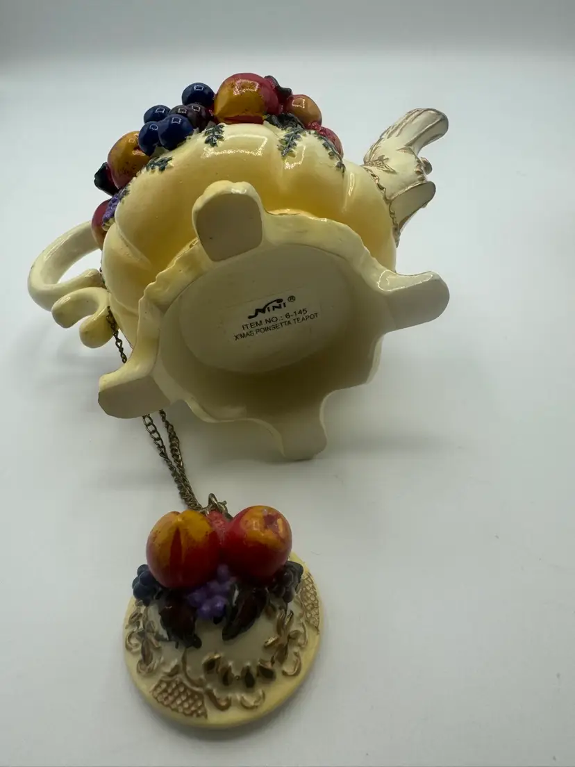 Beautiful Nini miniature hand painted teapot trinket box with chain. Beautiful condition. No chips or cracks. Measures 5" X 3 1/2" X 3 1/2"