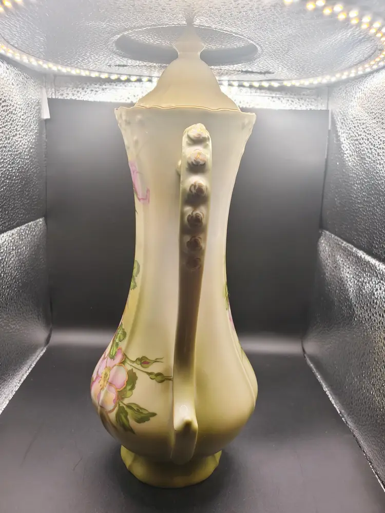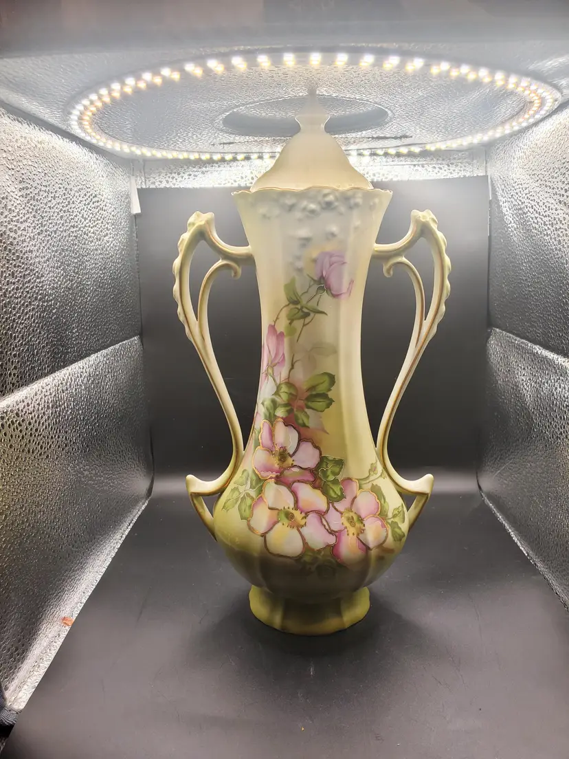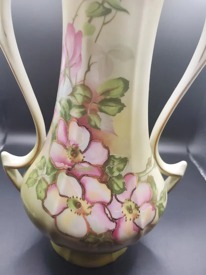 Amazing handpainted florals on this vase. Pink with gold accents. Marked Nippon. Greenish/yellowish in color. So pretty! 12" tall