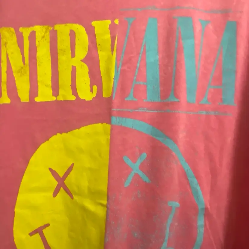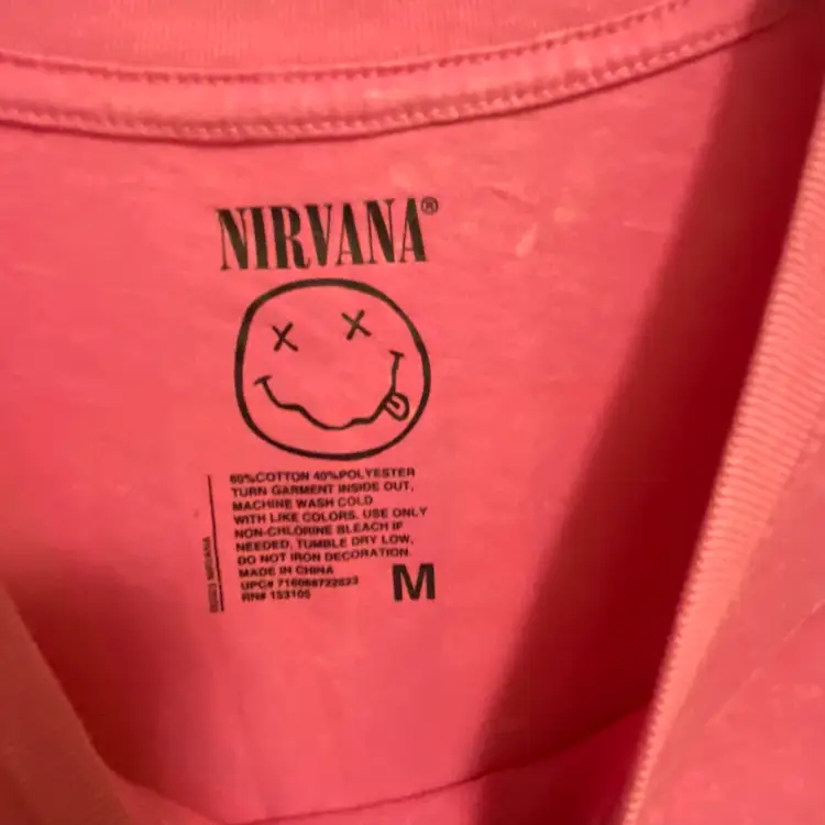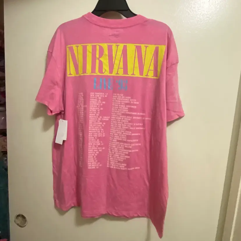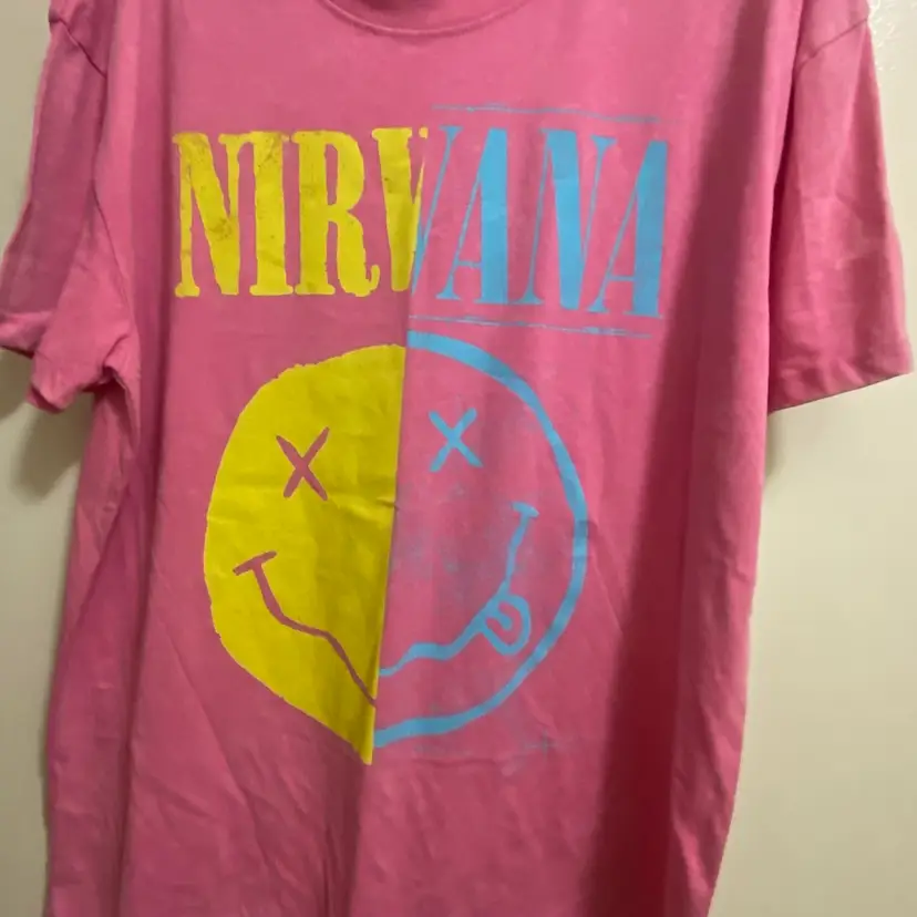 Nirvana Womens Pink Band Tee T Shirt M 46” Smiley Face 1993 Tour Back NWT New Brand new with tags 60% cotton / 40% polyester Smiley face distressed graphic on front and 1993 tour dates on back Shirt is a new reproduction and not vintage Oversized Pit to pit across is 23” for bust measurement of 46” Length 29” #bandtee #graphictee #nirvana #bubblegumpink #1993