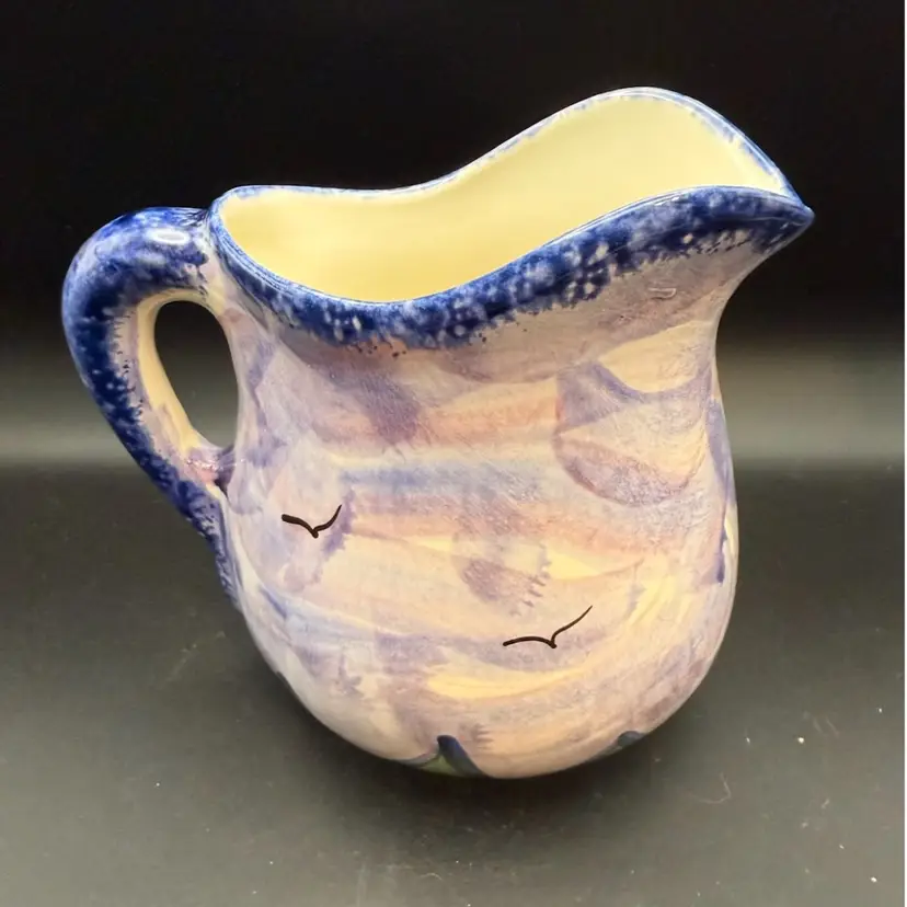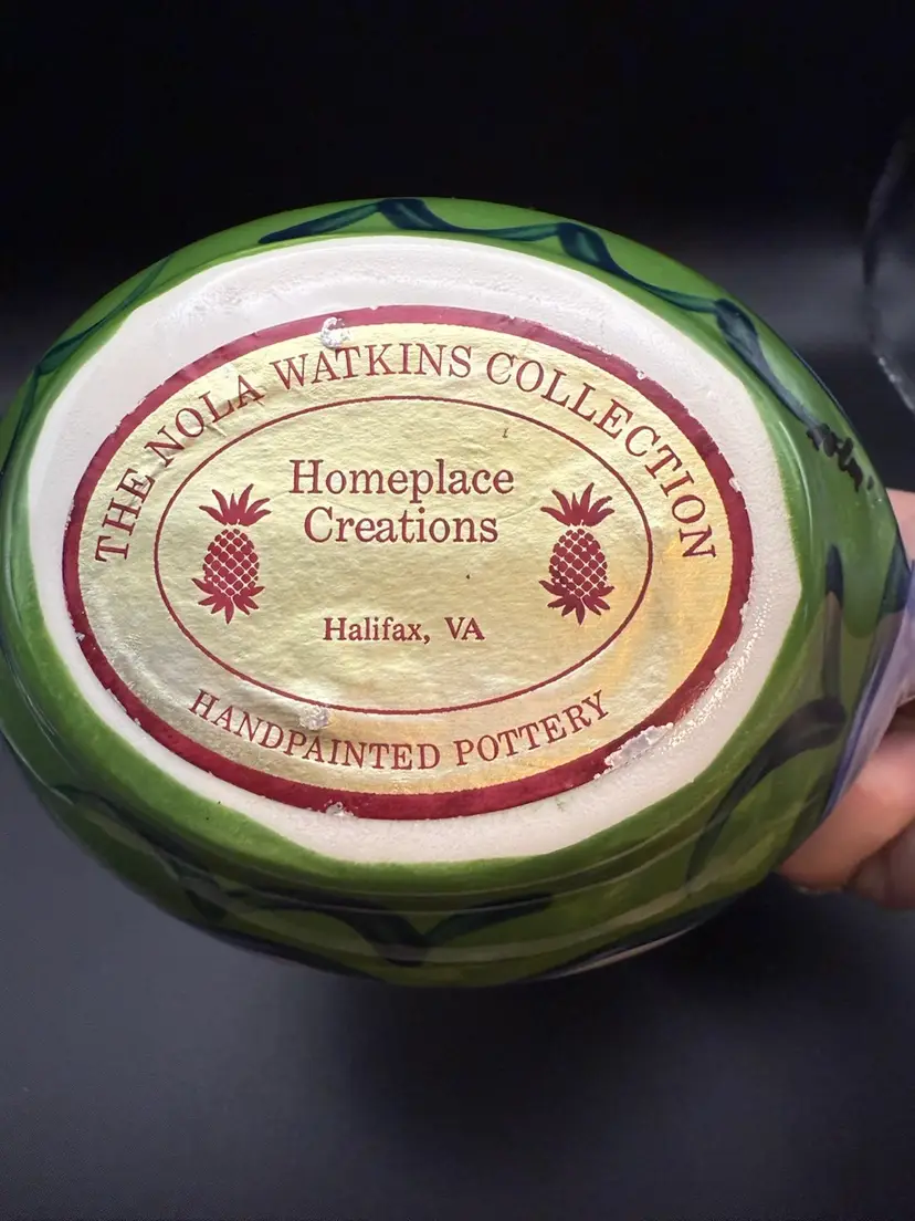 This is a Noah's Ark hand-painted ceramic pitcher. It is part of the Nola Watkins Collection, which is known for its handcrafted ceramic pottery. This particular pitcher features a depiction of Noah's Ark with various animals and the text "noah's ark". It is a discontinued piece, with a height of 7 7/8 inches and made of stoneware. The Nola Watkins Collection, founded by Bill and Nola Watkins, began with hand-painted ceramic pottery.