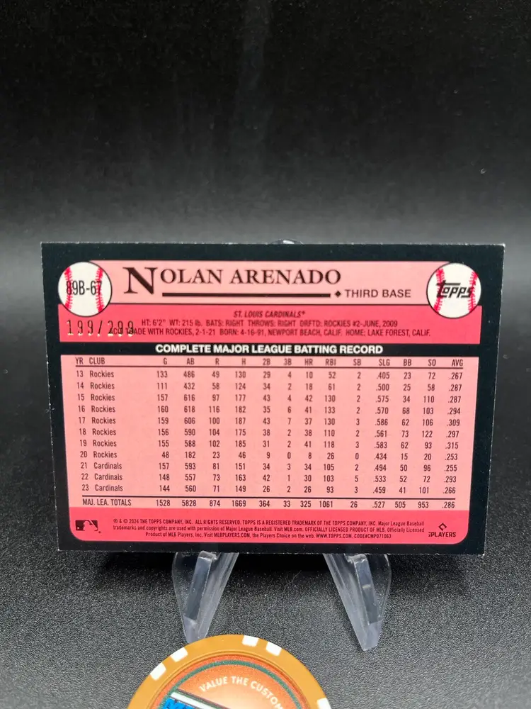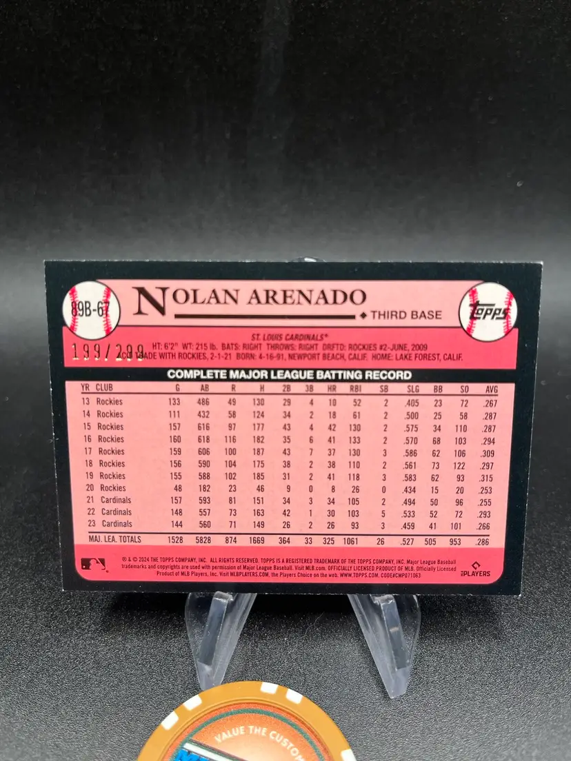 Topps 2024 1989 insert of nolan Arenado of the St Louis Cardinals. #199/299. Some chipping on border/corners. Priced accordingly.