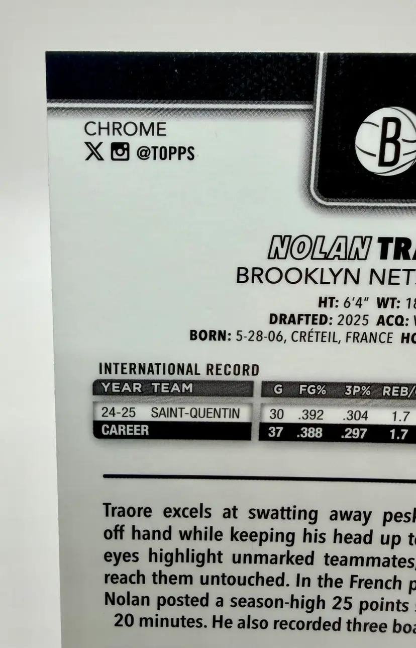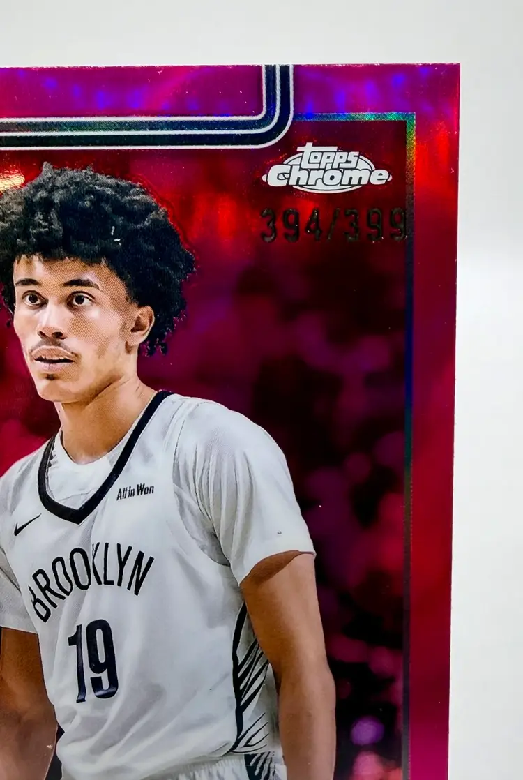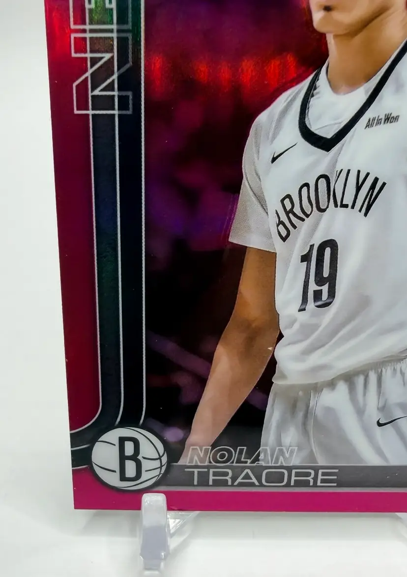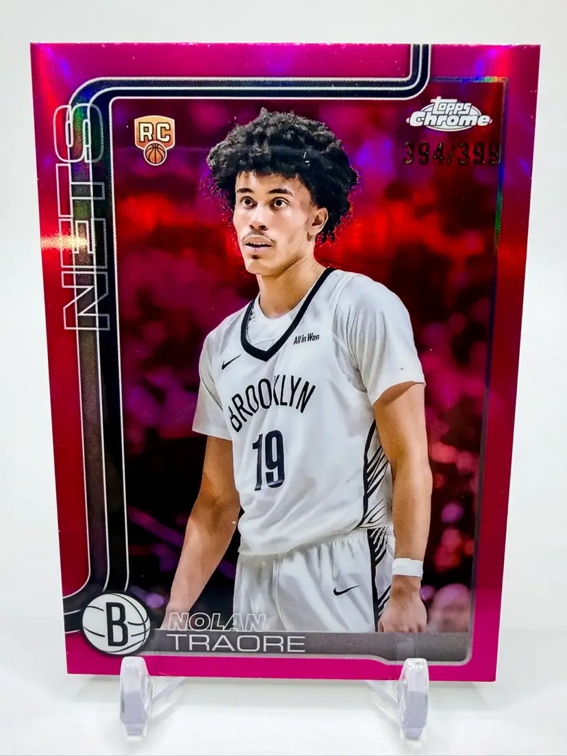 2025-26 Topps Chrome trading card featuring NBA player Nolan Traore of the Brooklyn Nets. This particular card is a Magenta Refractor parallel variety, with a serial number of /399, making it a rookie card.