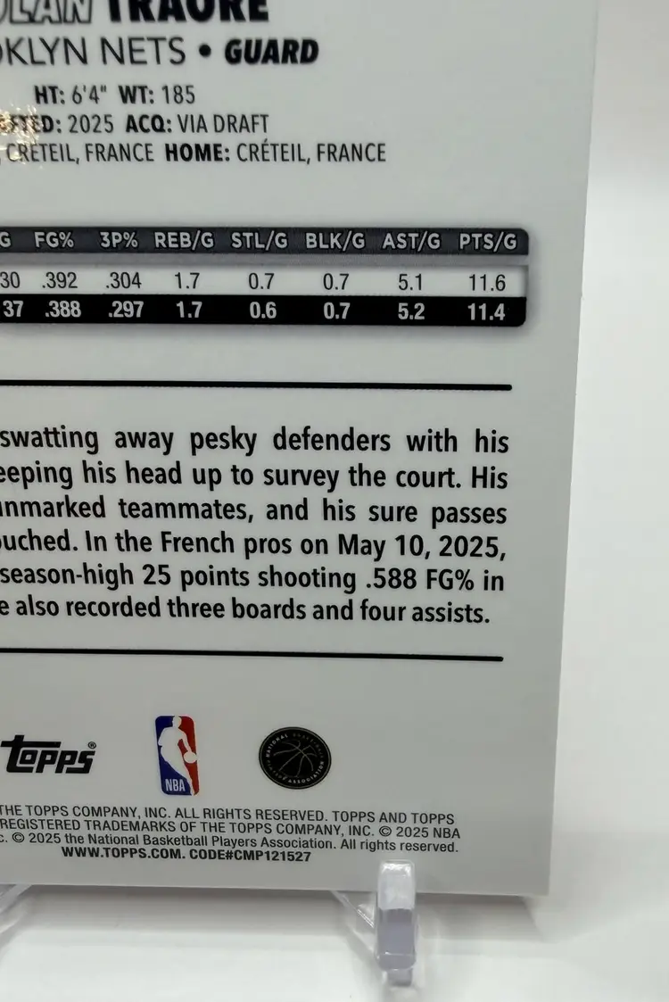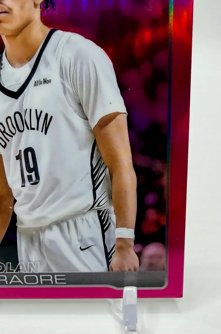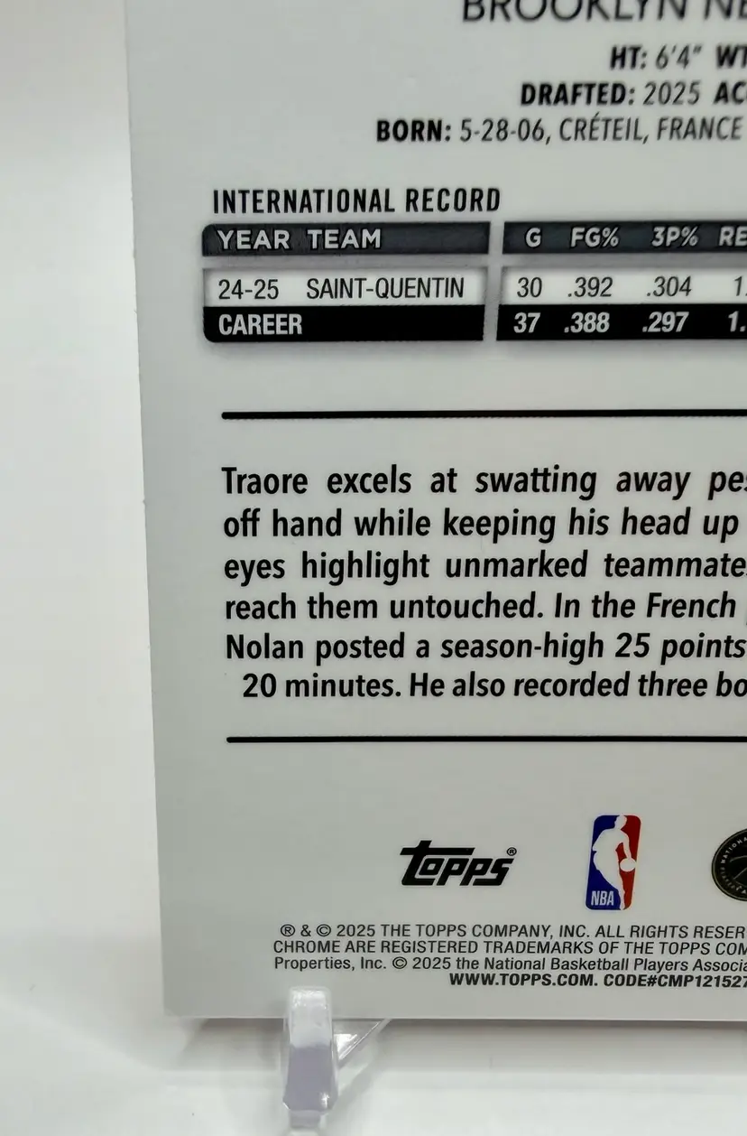 2025-26 Topps Chrome trading card featuring NBA player Nolan Traore of the Brooklyn Nets. This particular card is a Magenta Refractor parallel variety, with a serial number of /399, making it a rookie card.