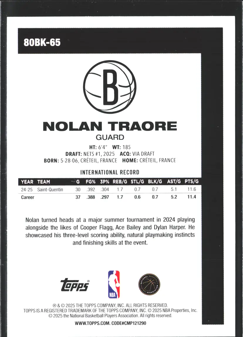 1st time buyer? Get $5 Off ($10 min) with code DISTRICT5 at checkout! Card as shown. All cards $20 and under ship PWE via lettertrackpro [https://www.letter-track.com/registerap.asp?AFID=8757] Set: 2025 Topps Card Name: Nolan Traore Rookie Card Number: 19 Player/Athlete: Nolan Traore Team: Brooklyn Nets Year Manufactured: 2023 Original/Licensed Reprint: Original Sport: Basketball Features: Rookie