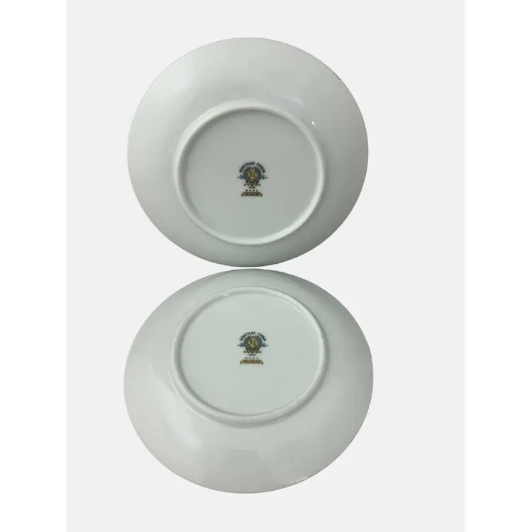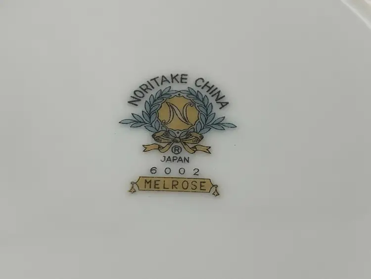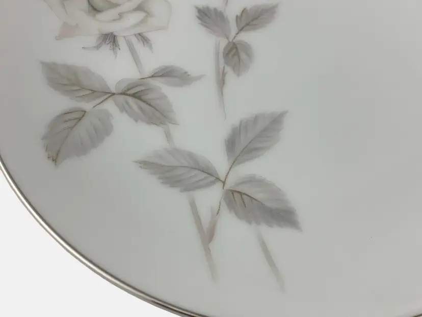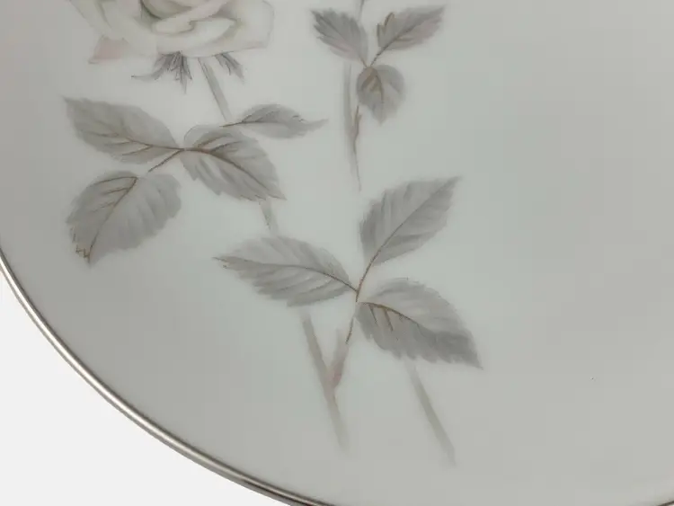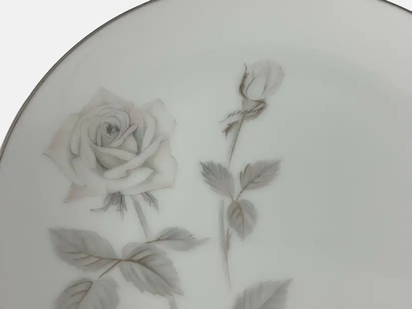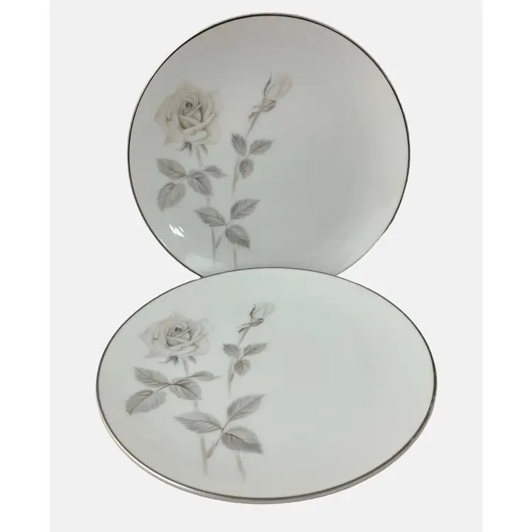 Pair of Noritake China Bread and Butter Plates in the Melrose pattern. They are 6 3/8" across. This pattern was made from 1959 - 1971 and is now discontinued. It has a pale pink rose and bud on gray stems with platinum trim.