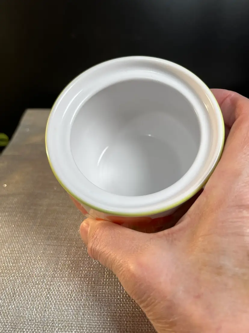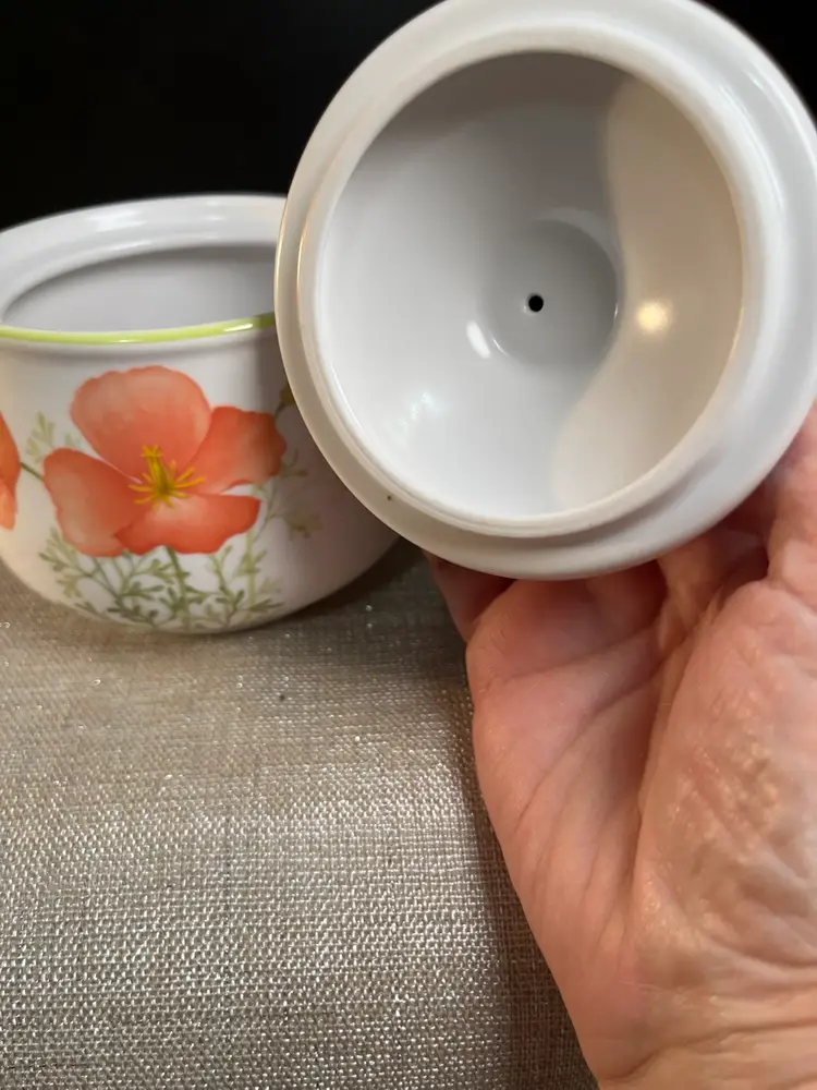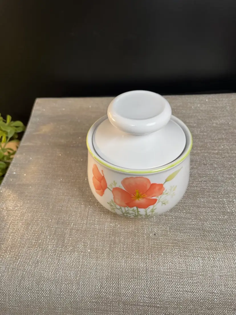 This is a sugar bowl. But....I love poppies so I couldn't leave it behind. Makers mark on bottom. It is numbered 9079. It is in fantastic condition. It measures approx 4.5"H, 3.5" Diameter, 11.7 Oz