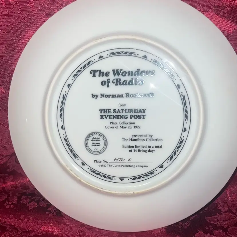 A collector's plate featuring Norman Rockwell's artwork, titled "The Wonders of Radio". This artwork was originally a cover for The Saturday Evening Post published on May 20, 1922. The plate is part of The Saturday Evening Post Plate Collection. It is an 8.5-inch collector's plate, often with gold trim.