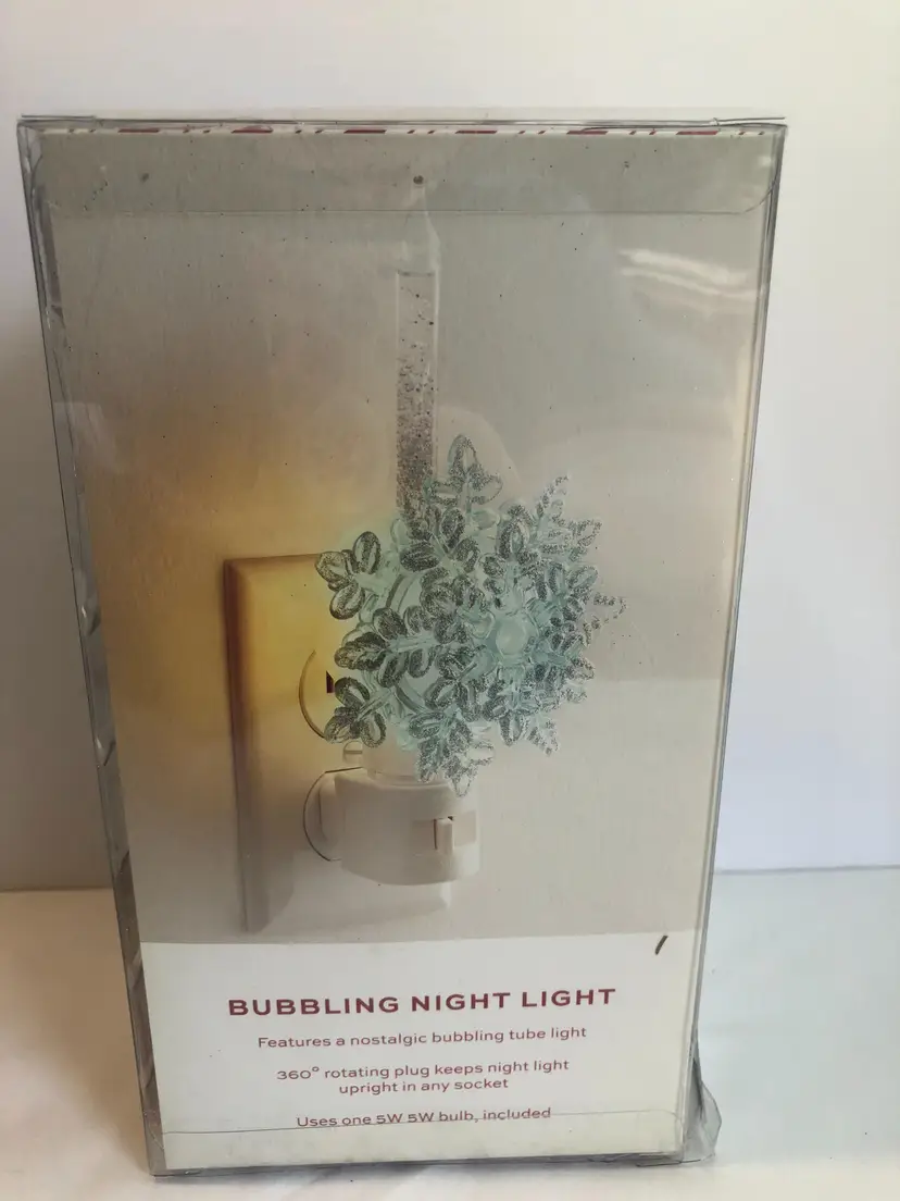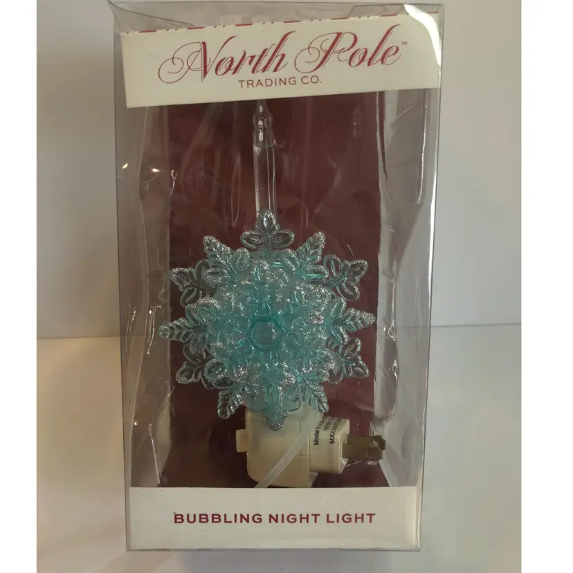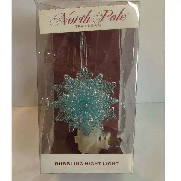 North Pole Trading Co Bubbling Night Light Blue Glitter Snowflake Silver Retro. New in the box. I have taken out of the box to test and it works and bubbles fine. 7.25" tall. Swivel plug.