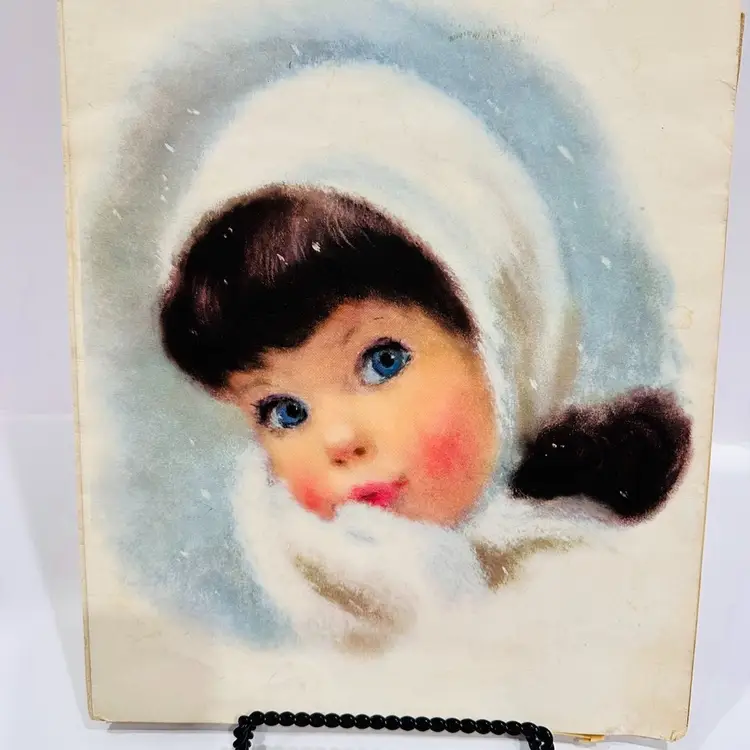 Choice of Vintage 1960’s Frances Hook pastel portraits. Baby in Pink Blanket Blond Girl with Yellow Flowers Brunett Girl in White Snow Cap Chesnut Hair Girl with White Kitten
