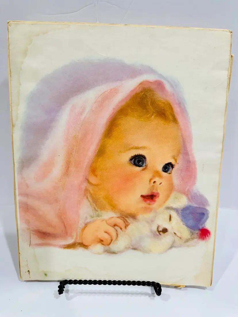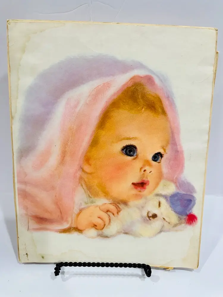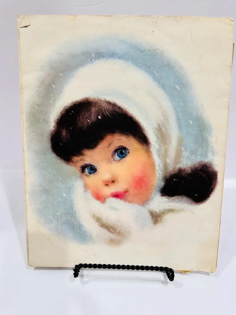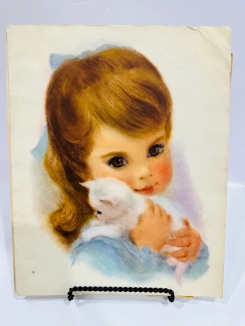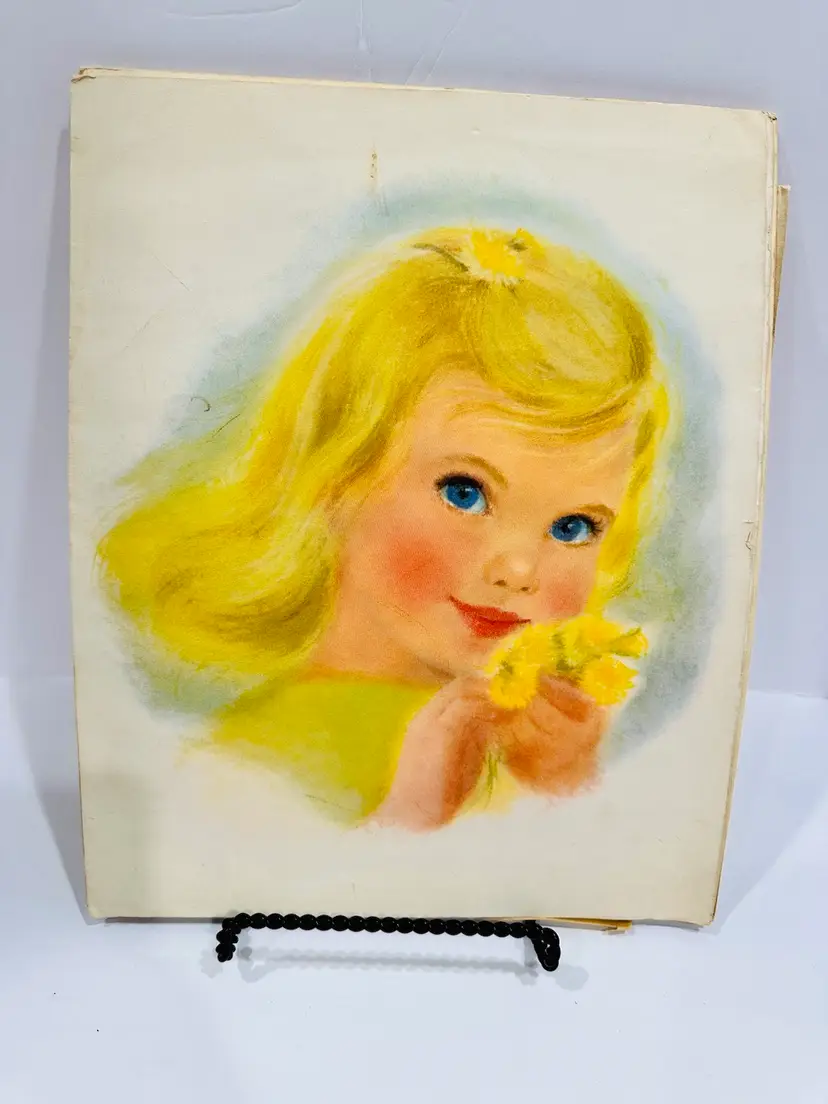 Choice of Vintage 1960’s Frances Hook pastel portraits. Baby in Pink Blanket Blond Girl with Yellow Flowers Brunett Girl in White Snow Cap Chesnut Hair Girl with White Kitten