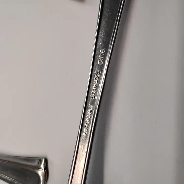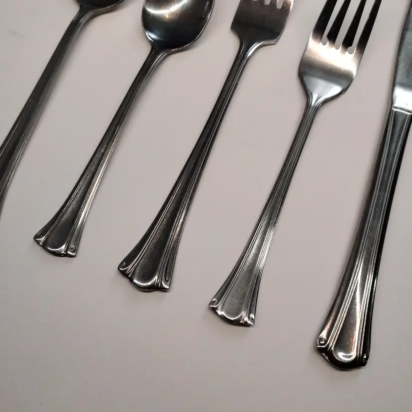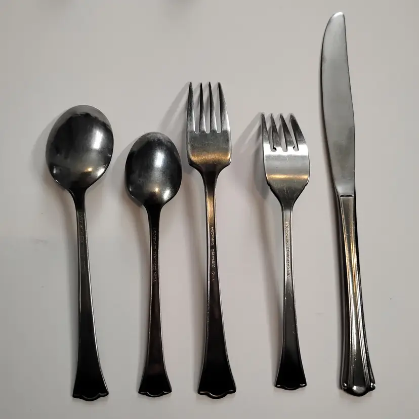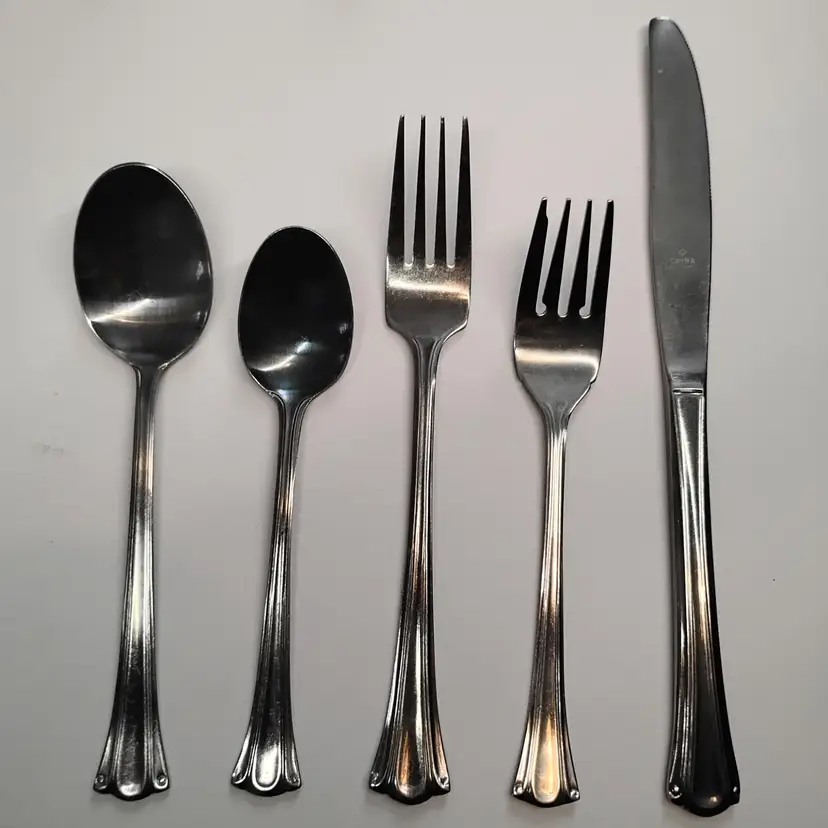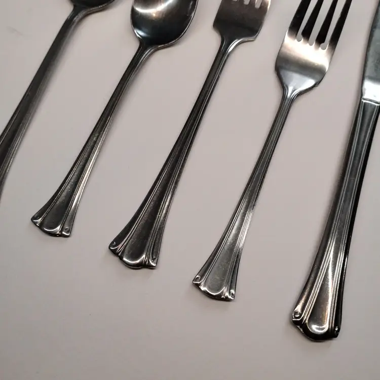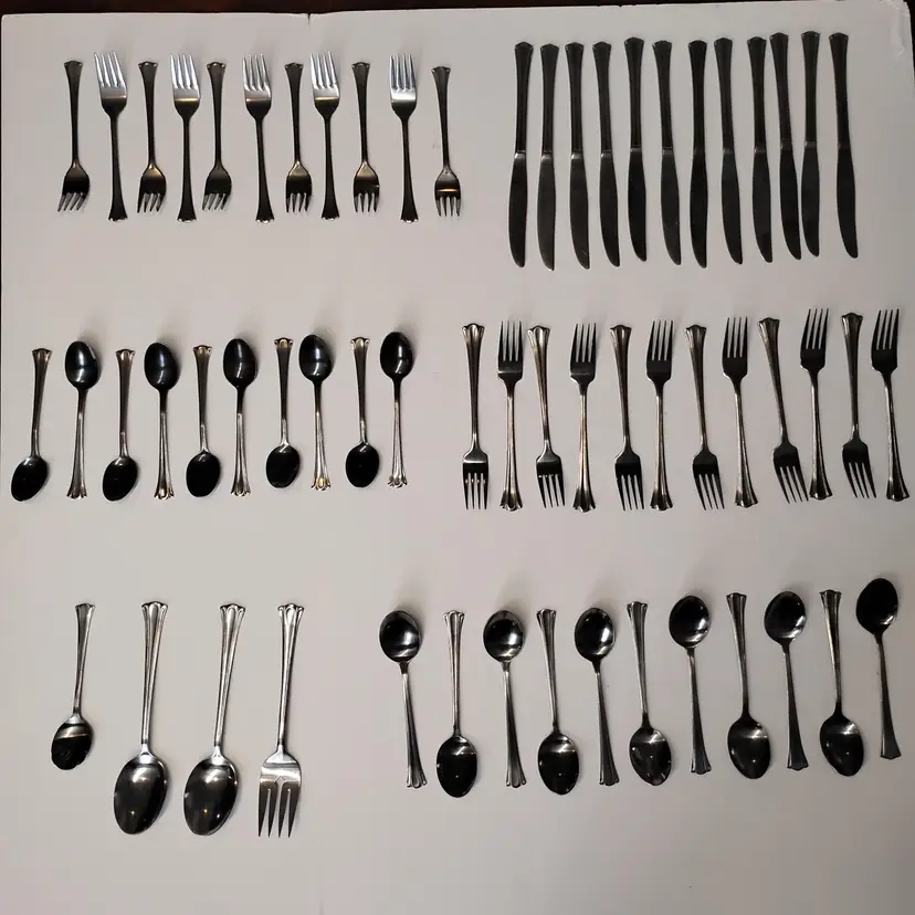 10 teaspoons 11 tablespoons 11 salad/ dessert forks 12 dinner forks 12 dinner knives 2 serving spoons 1 serving fork 1 scalloped spoon