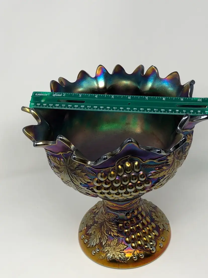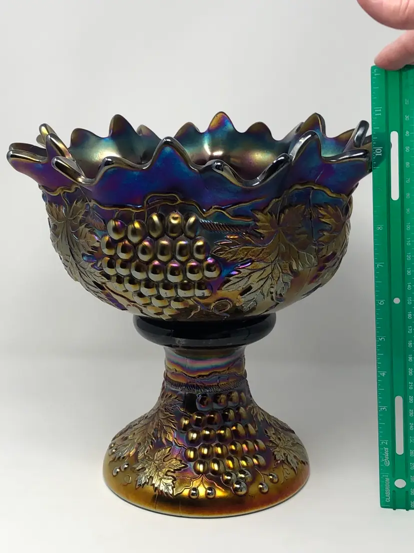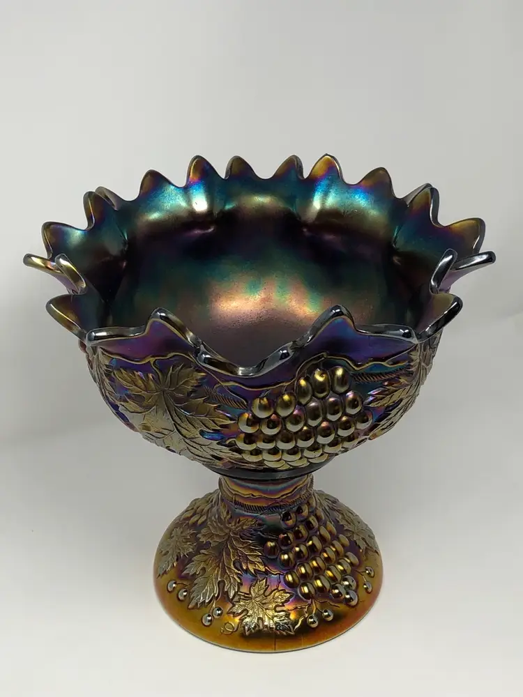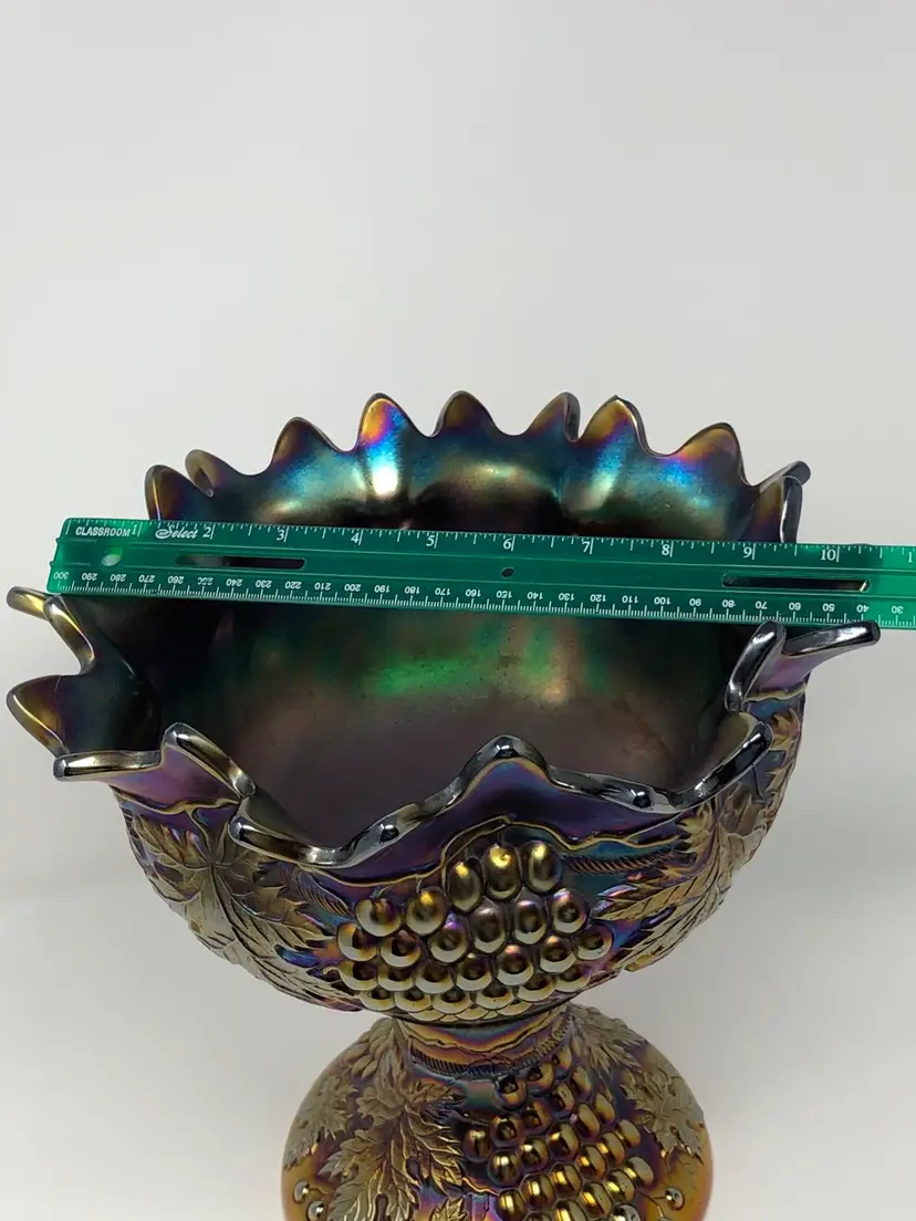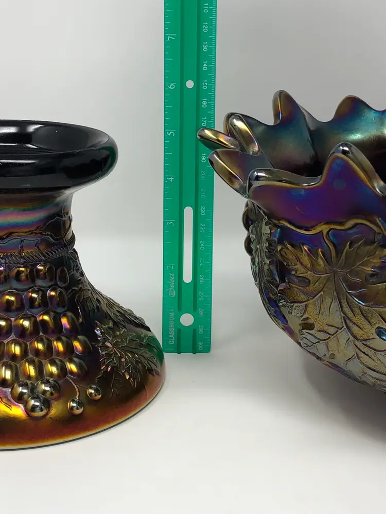 So magnificent! This set is so beautiful! Heavy iridescence over beautiful purple glass. There is one tip broken on the rim I just noticed in the light box. Both pieces carry the Northwood mark, as shown in photos