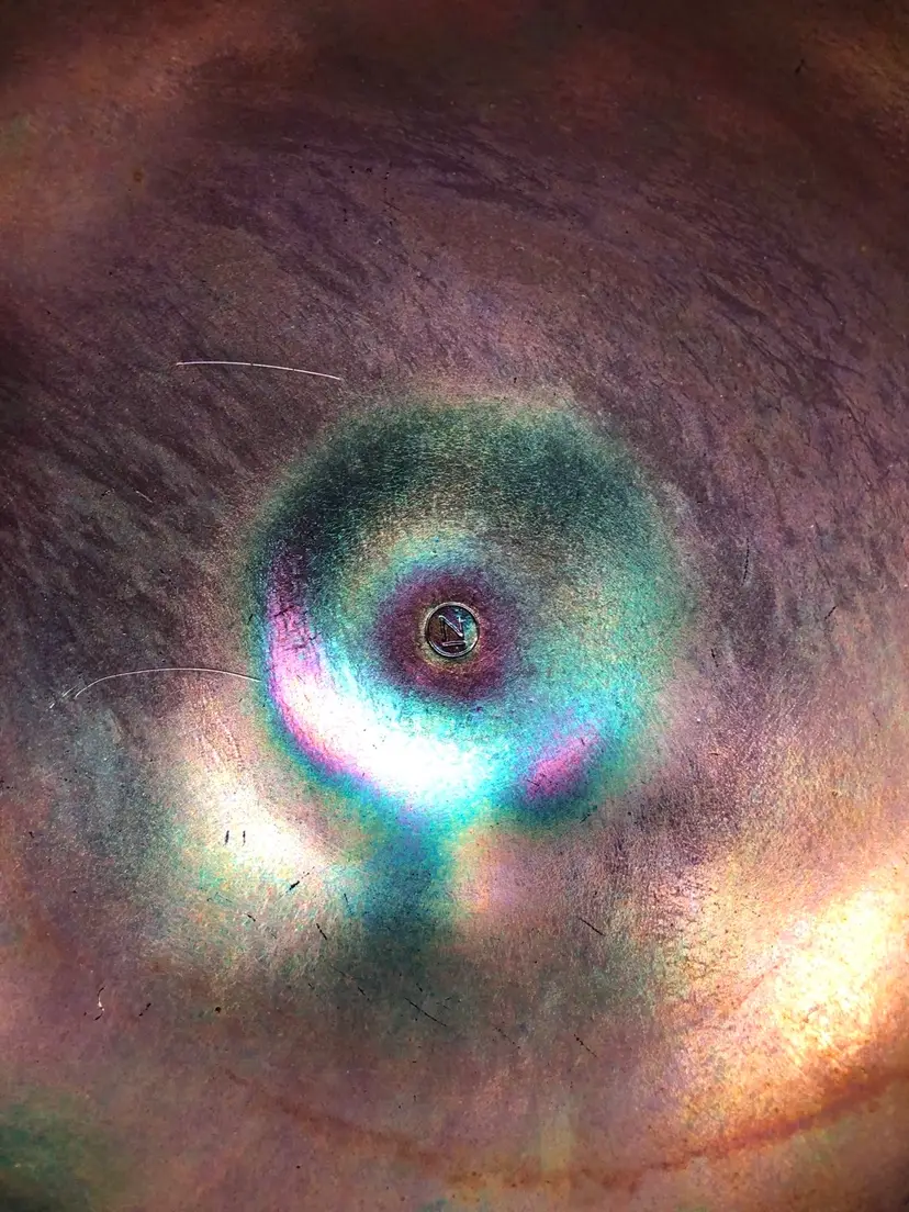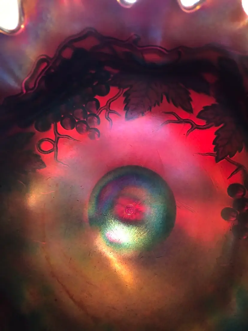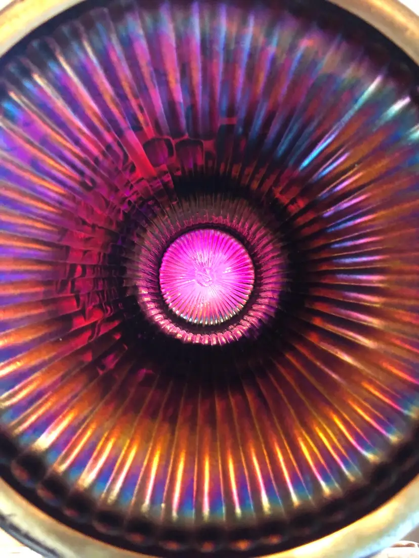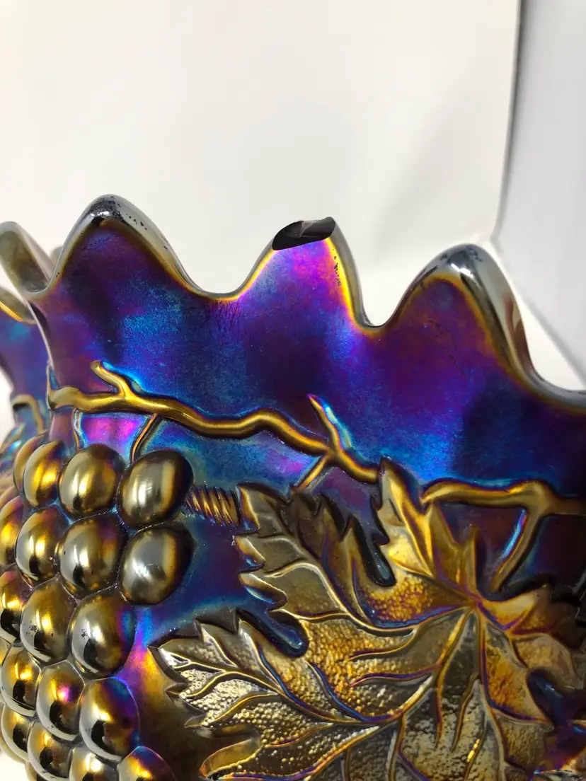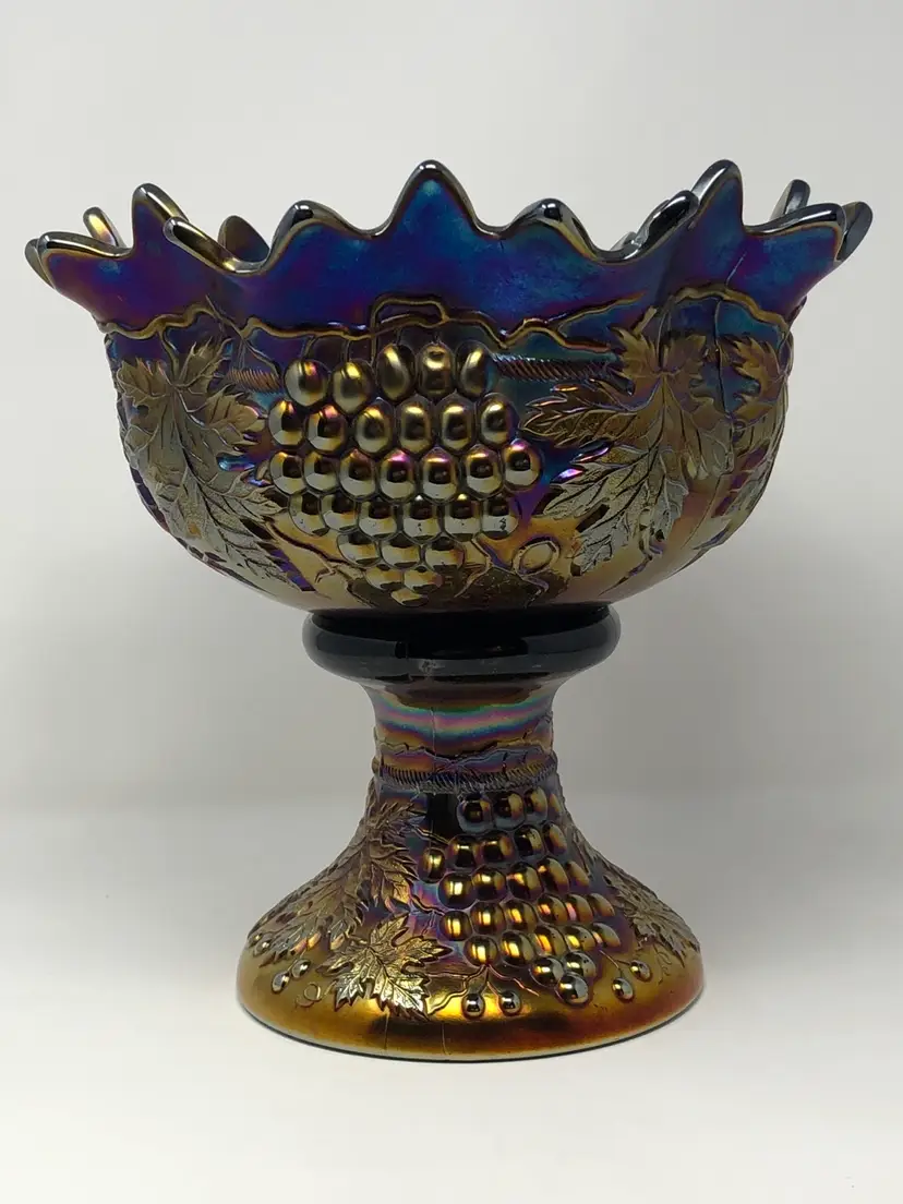 So magnificent! This set is so beautiful! Heavy iridescence over beautiful purple glass. There is one tip broken on the rim I just noticed in the light box. Both pieces carry the Northwood mark, as shown in photos