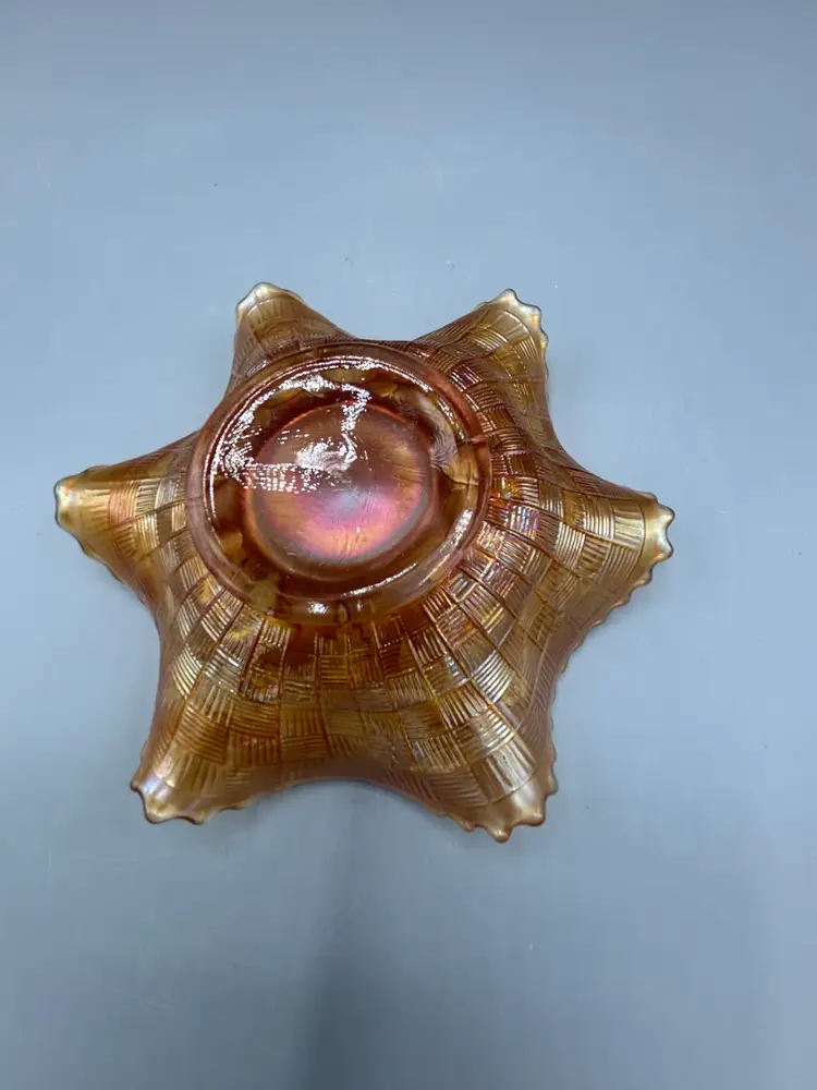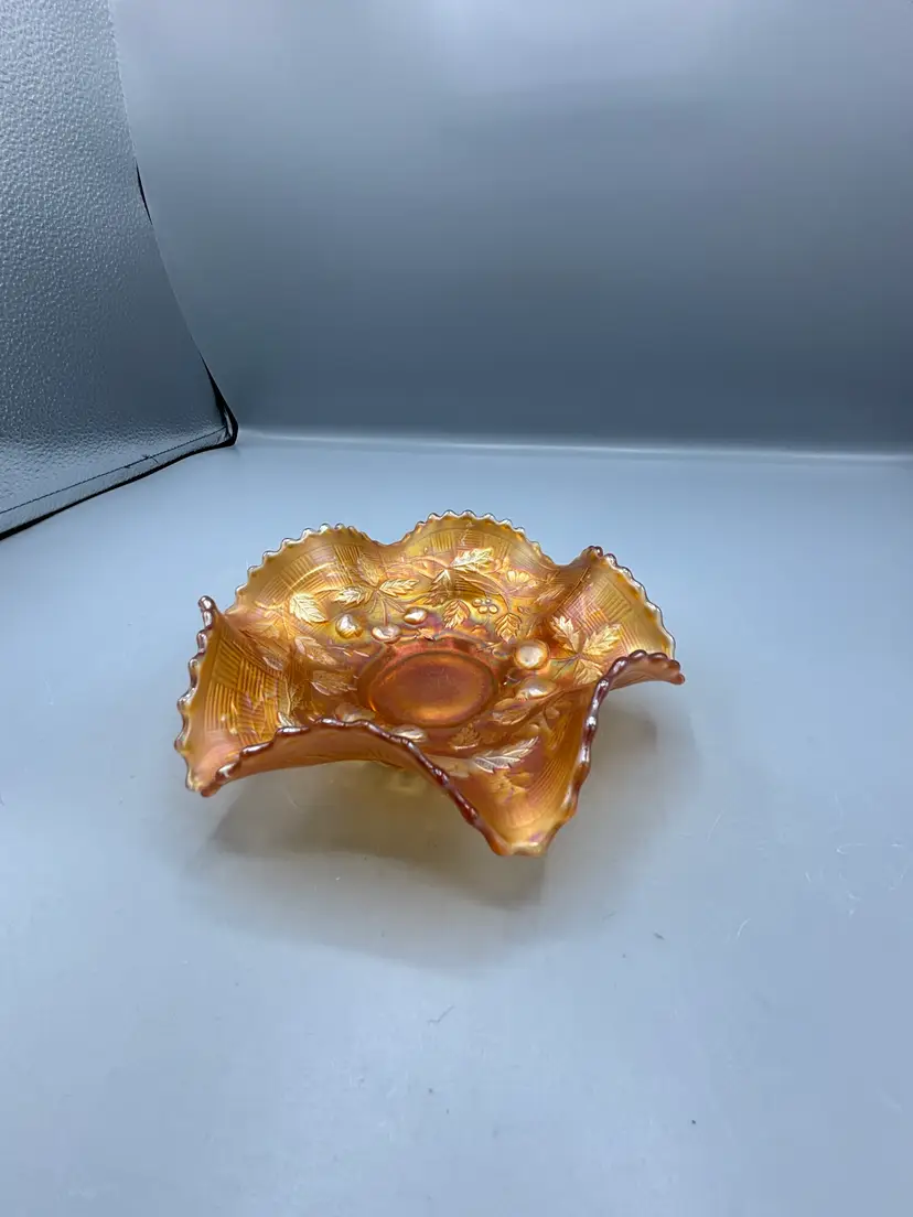 This striking Northwood carnival glass bowl showcases the iconic marigold hue paired with an intricate fruits and flowers motif. Standing 2 inches tall with a 6-inch diameter, it exemplifies the craftsmanship characteristic of early 20th-century iridescent glassware. A distinguished addition to any carnival glass collection.