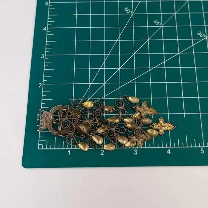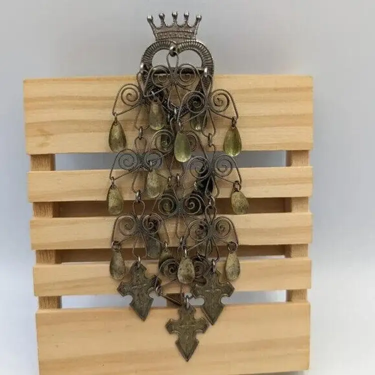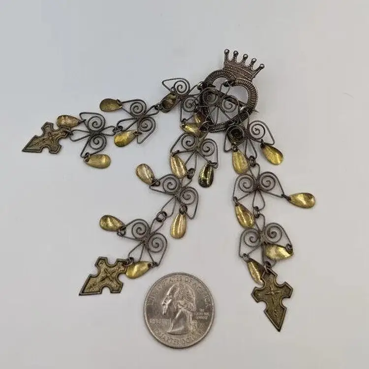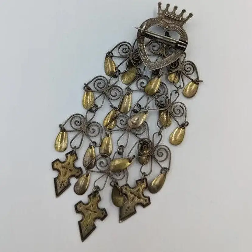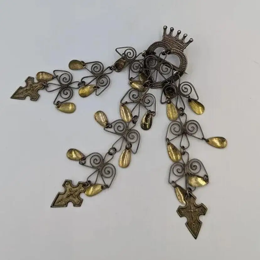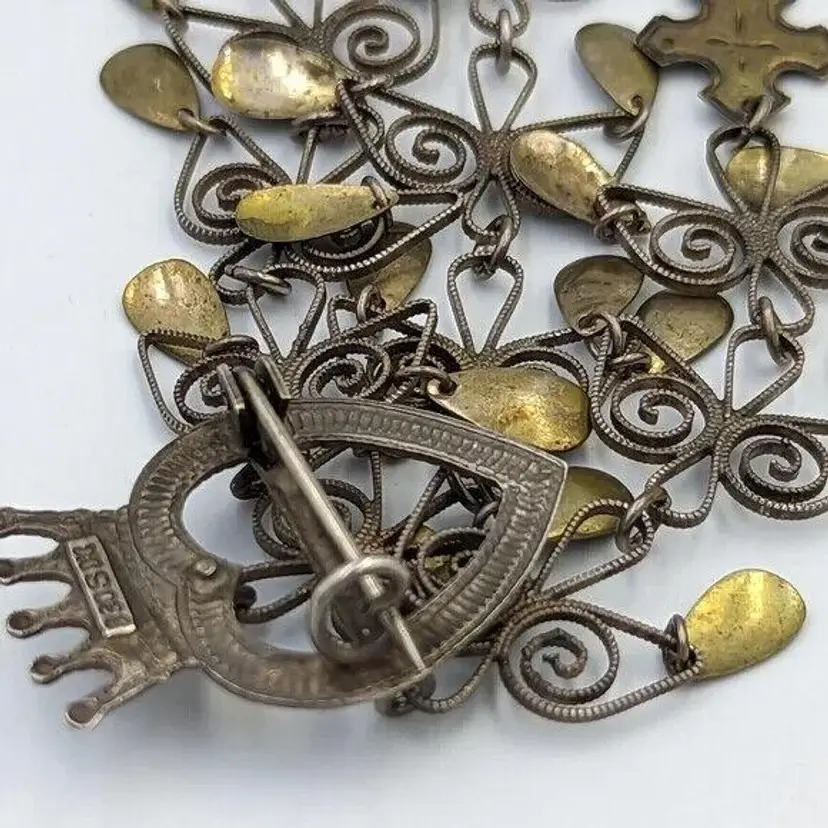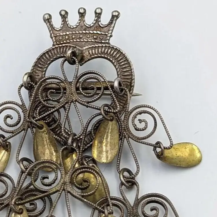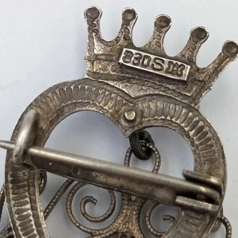 Vintage Norway Solje Heart Crown Dove Cross Silver Gold Bunad Pin Brooch 830 vintage Norwegian Solje pin / brooch. Solje pins are a traditional jewelry in Norway intended for wearing with the national costume called bunad. This large pin is made of 830 silver, has a beautiful Heart & Crown design with small golden teardrop "spoons" hanging from scrolled doves, ornate cross dangles and has a fantastic patina. Measuring roughly 4 1/4" x 2", marked on the back with 830 S and what appears to be a butterfly mark weighing 14.2g. It has a "c" catch fastener that holds tight and secure.