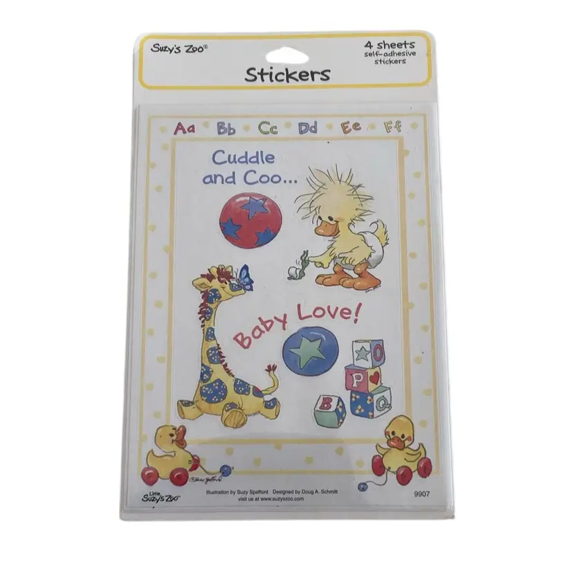 New old stock Suzy’s Zoo package of stickers with Cuddle and Coo Baby designs. Each package contains 4 sheets. Made in the USA. #9907.