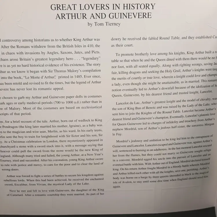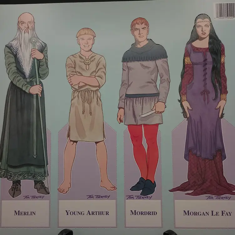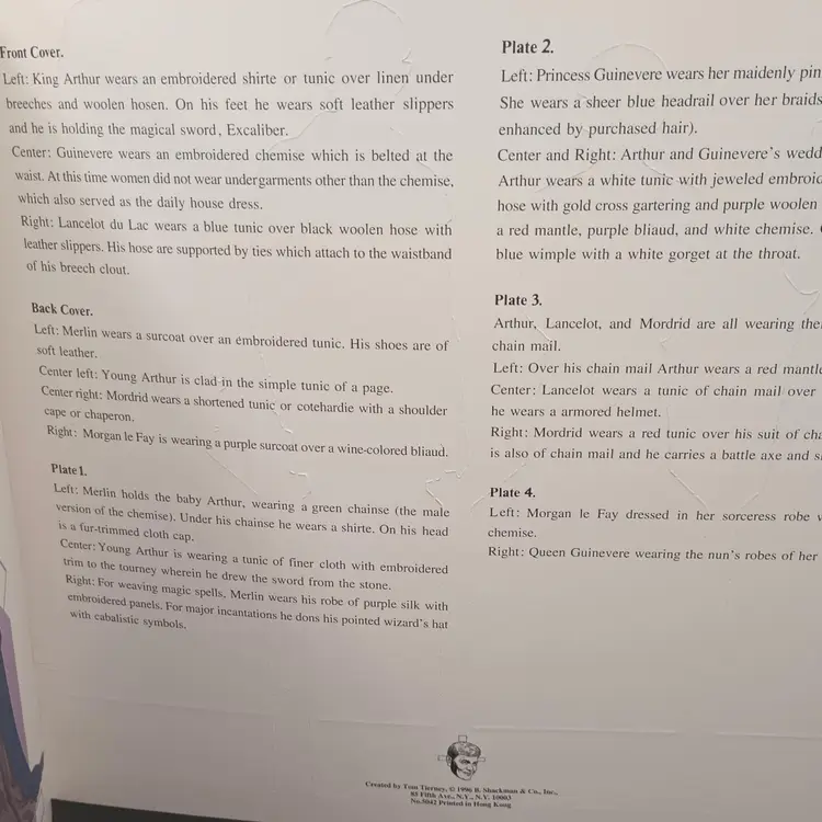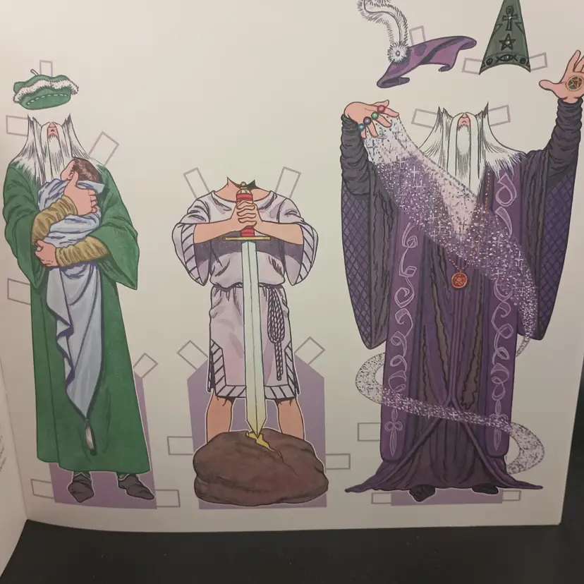 This vintage New Old Stock B. Shackman & Co Paper Doll book features characters from the Camelot franchise including King Arthur, Lady Guinevere, Lancelot Du Lac, Young Arthur, Mordrid, Morgan Le Fay, and Merlin. There are 7 paper dolls and 11 costumes. The book was manufactured in 1996 and is an original print. The paper material adds to the charm of this unique item. The paper dolls are in excellent condition and ready to be brought to life by their new owner. This book is perfect for collectors and fans of the Camelot franchise.