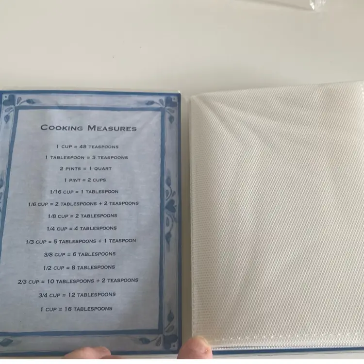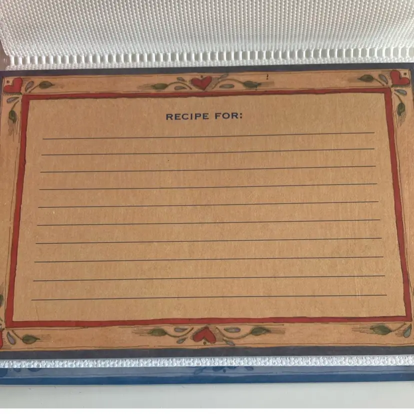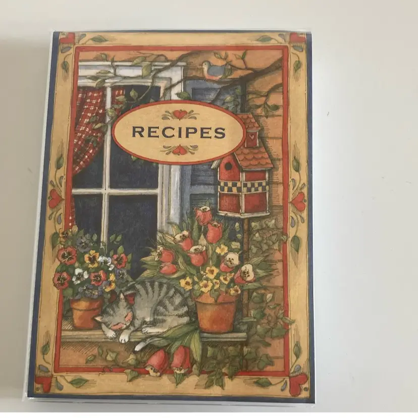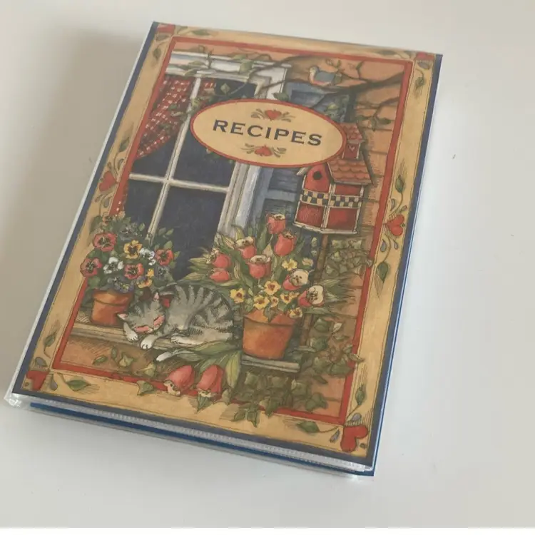 New old stock Gibson Susan Winger recipe card album with new cards. Overall it measures 4 1/2” x 6 1/2”.