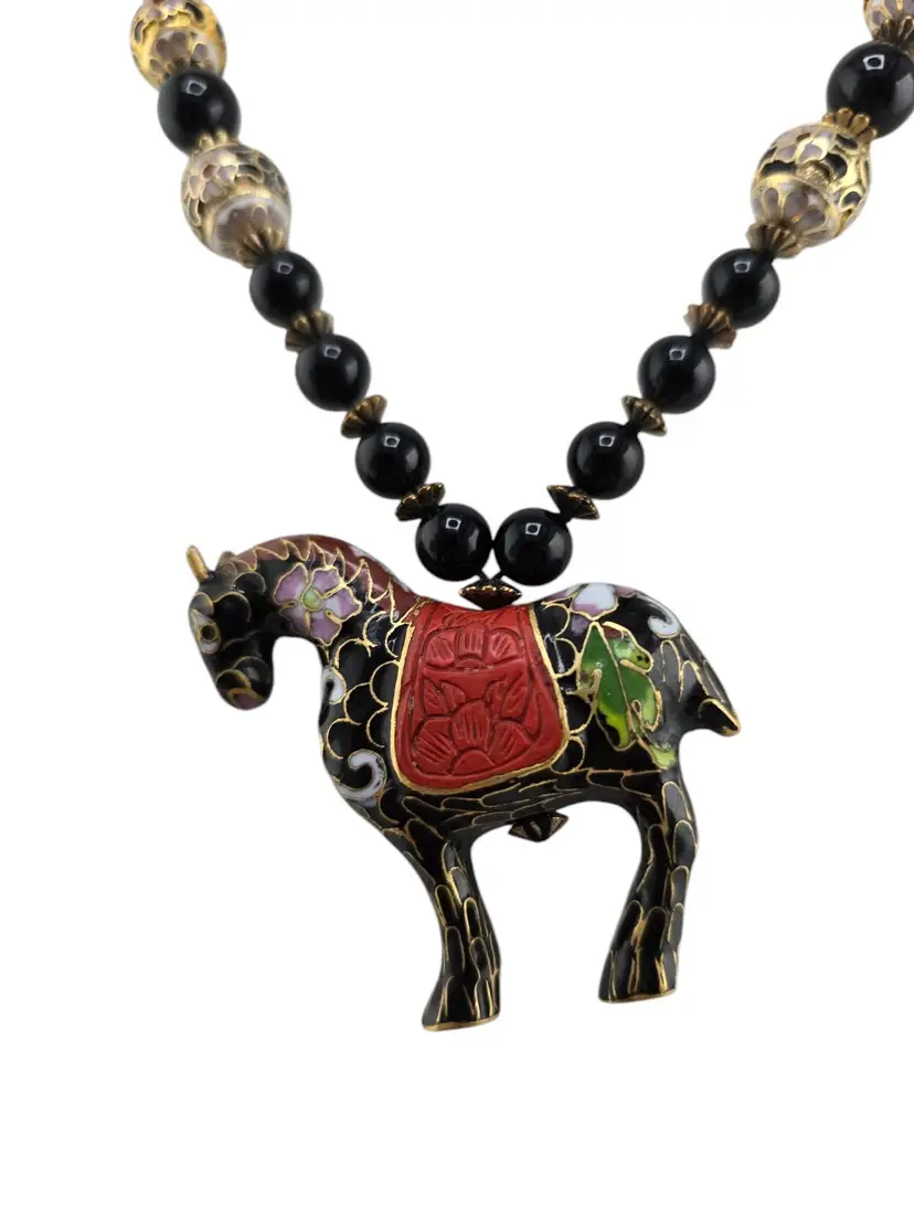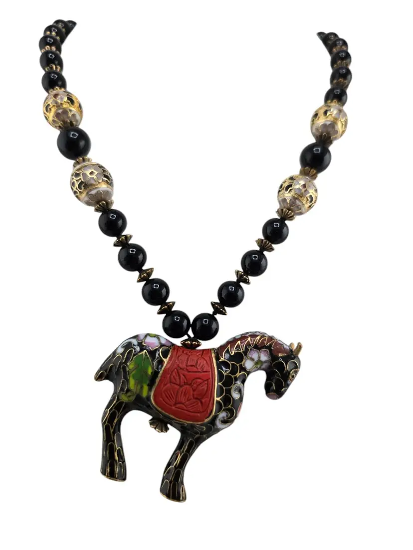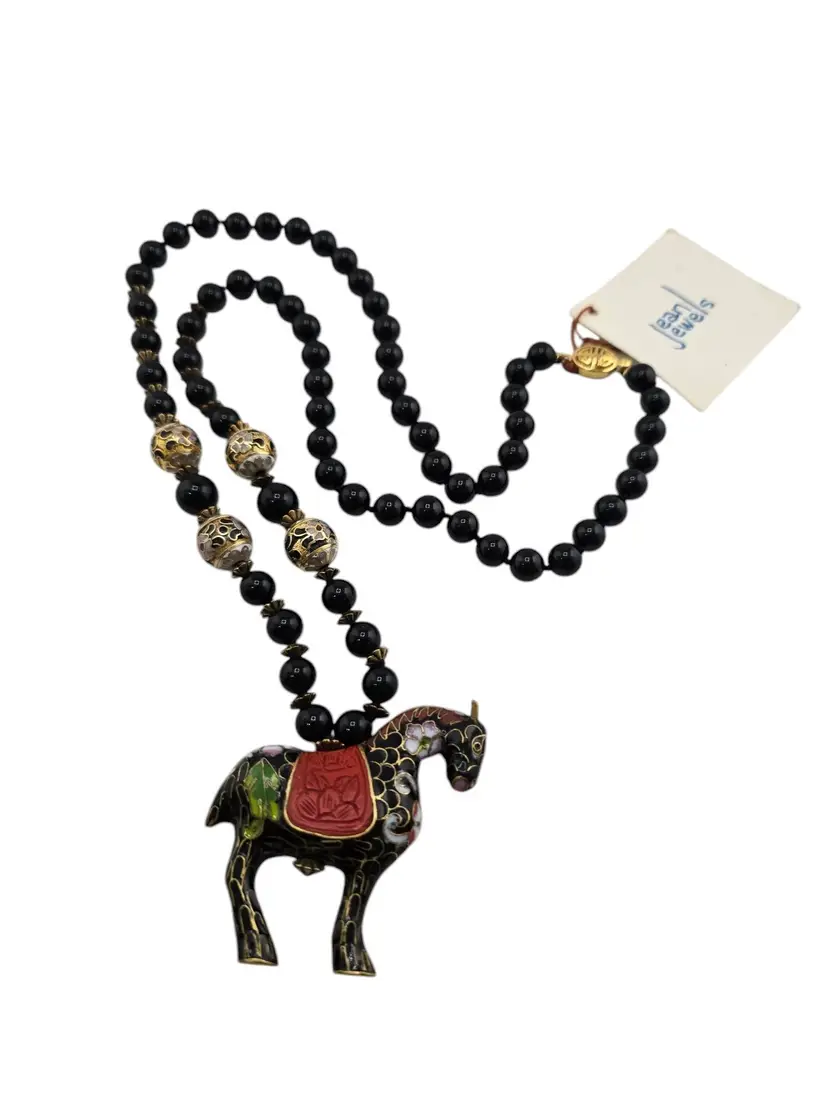NOS Stunning Onyx? And Cloisonné Hand Knotted Necklace w/ Cloisonné Beads And Horse Original Tag (A7843)